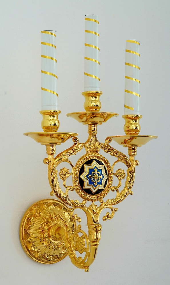 Изящная настенная лампа состоит из узорчатого круглого основания, которое крепится к стене, и подсвечника с тремя свечами. Основание подсвечника украшено крупным медальоном, представляющим собой покрытую эмалью гальванопластическую накладку. В центре медальона находится крест, окруженный лепестками цветка. По желанию заказчика цвет эмали может быть изменен.