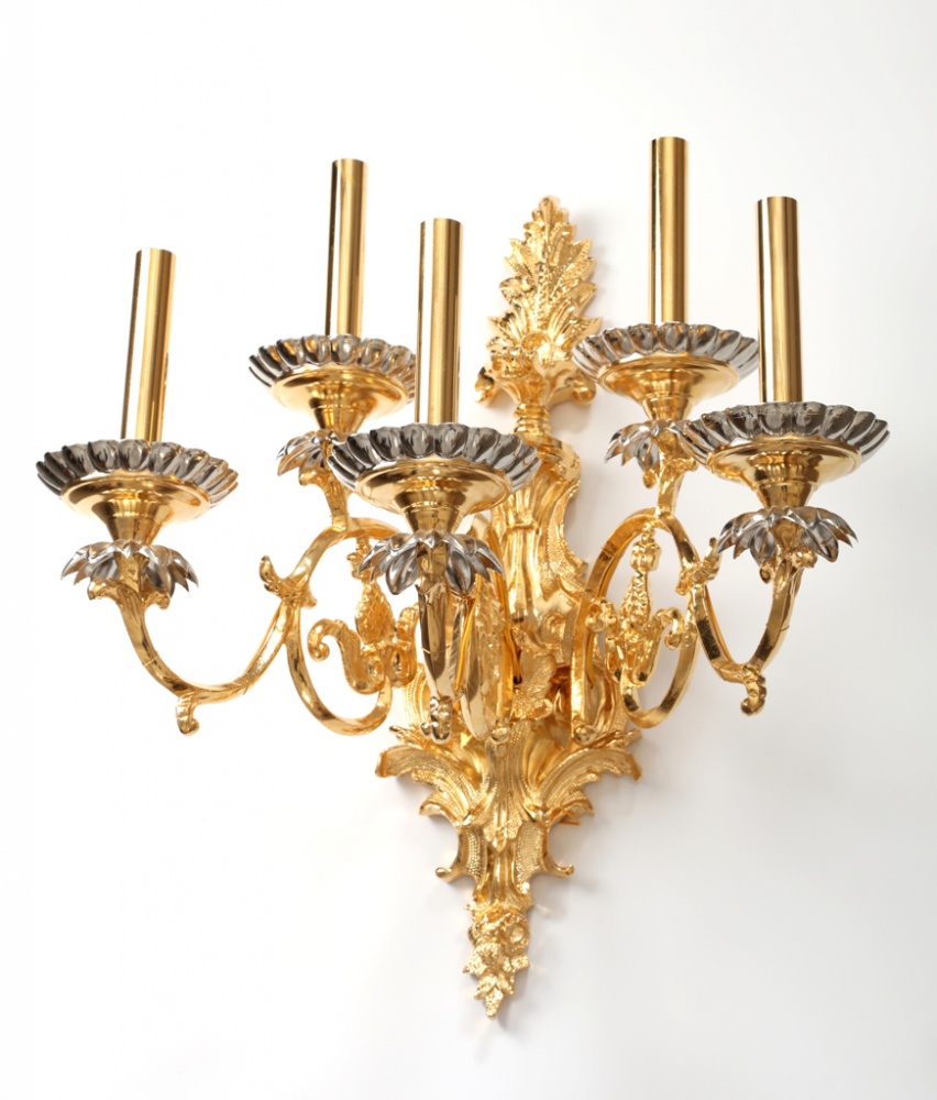 Царственная и изысканная, двухъярусная настенная лампа с пятью свечами станет не только источником света, но и украшением храма наравне с паникадилом. Некоторые детали позолоченного светильника выделены серебряным цветом, что добавляет изделию контрастность и объем.