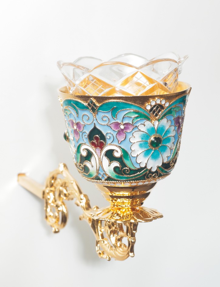 Стаканы из цветного хрусталя временно отсутствуют. Лампады можно изготовить только с прозрачным хрустальным стаканом либо со стаканом из окрашеного цветного стекла.
