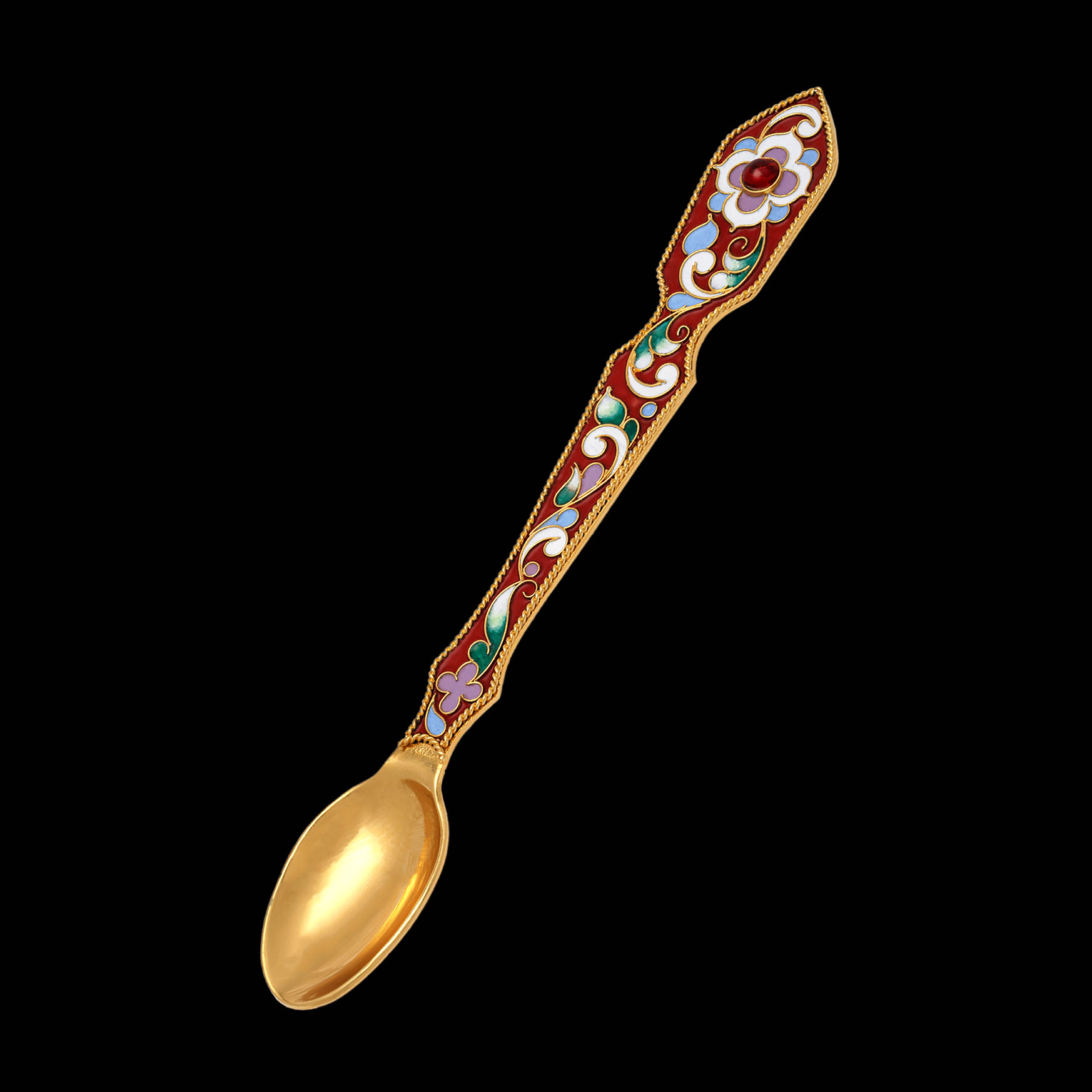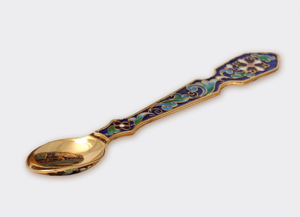 Изящная лжица, выполненная из меди и покрытая позолотой, станет настоящим украшением евхаристического комплекта. Ручка лжицы украшена тонким филигранным узором, раскрашенным яркой эмалью. Изделие имеет габариты 165х70х10 мм.