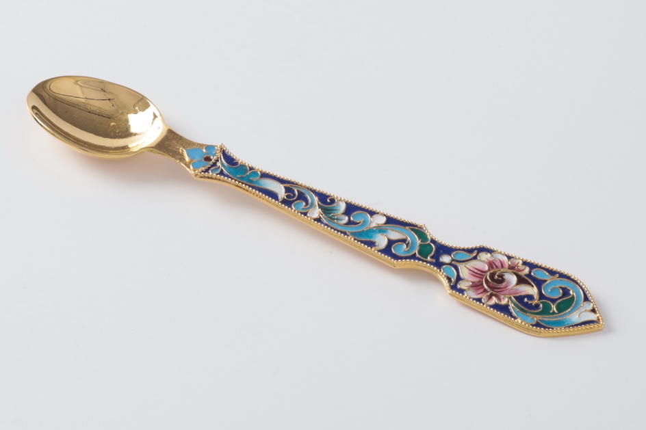 Яркая лжица, выполненная из меди и покрытая позолотой, сразу привлекает к себе внимание необычной ручкой. Ручка, обвитая тонким филигранным кружевом, раскрашена яркой эмалью голубых, розовых и зеленых оттенков. Благодаря рельефной поверхности, лжица не будет скользить в руке священнослужителя.