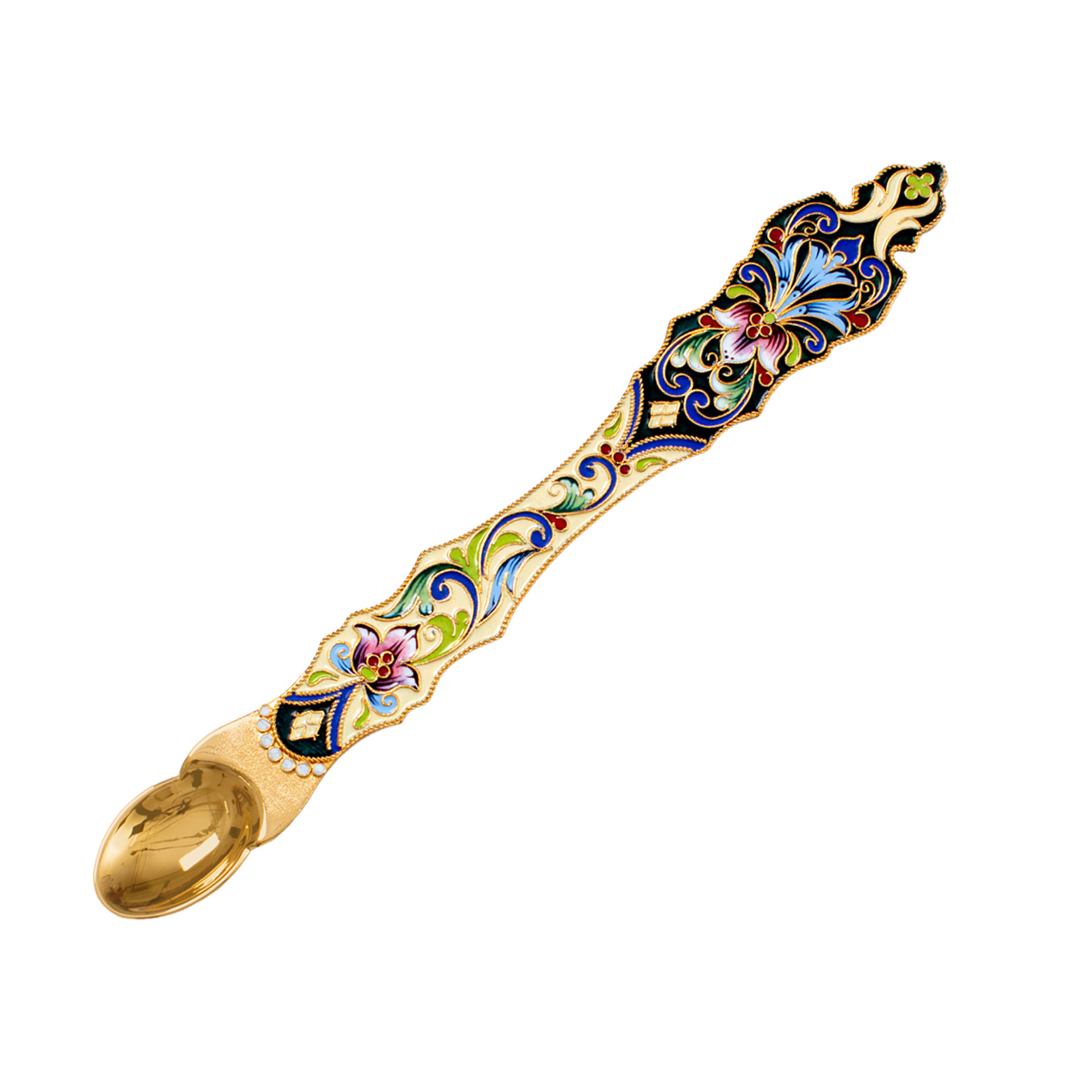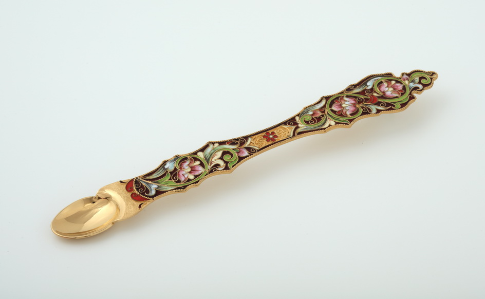 Праздничная лжица, выполненная из меди и покрытая позолотой, имеет габариты 243х35х10 мм. Ручка лжицы украшена тонким филигранным узором, раскрашенным яркой эмалью бордово-розовых оттенков. Сужающаяся к центру и украшенная рельефными украшениями, ручка будет удобно лежать в руке священнослужителя.