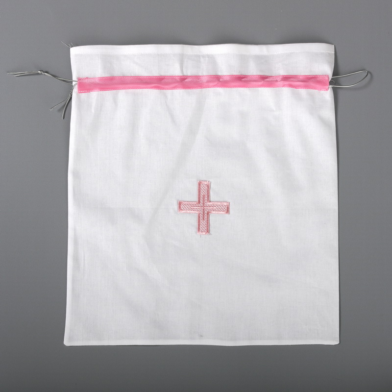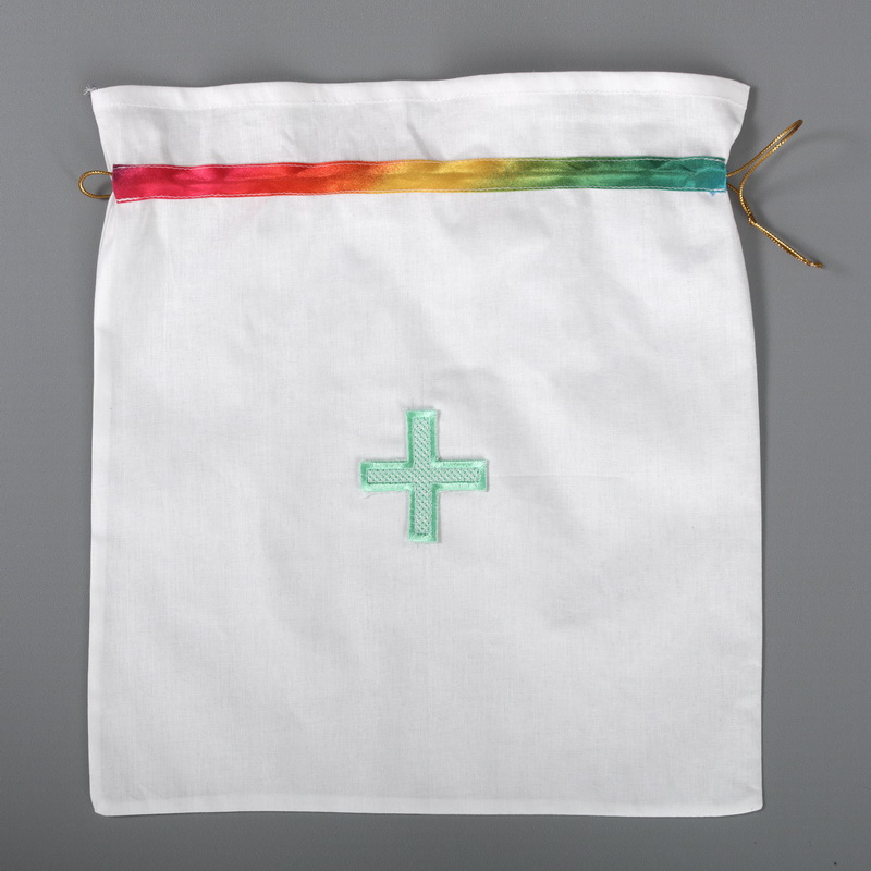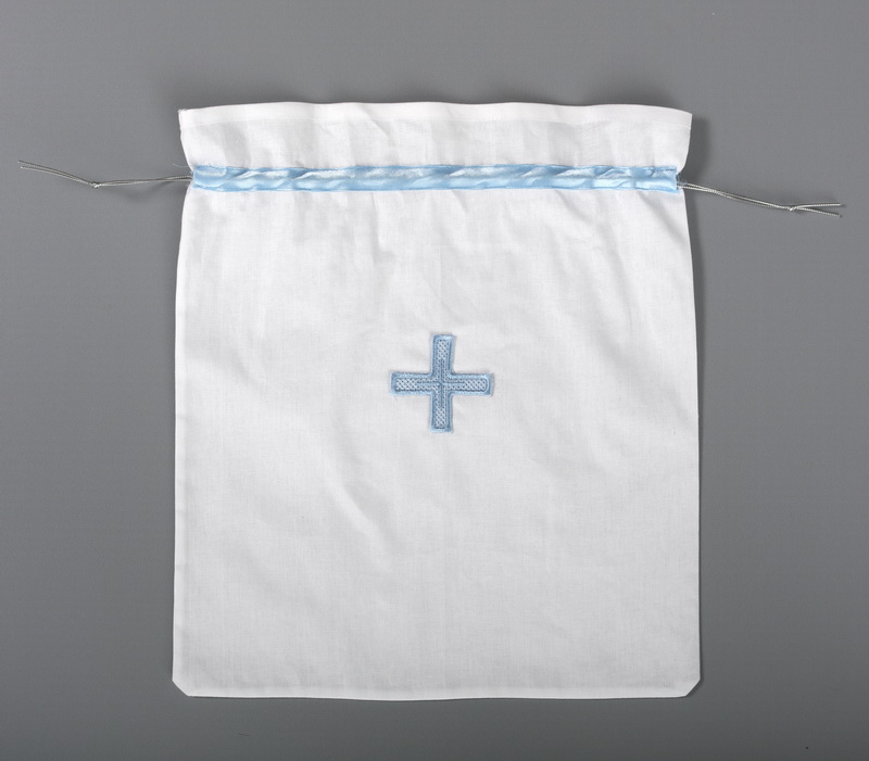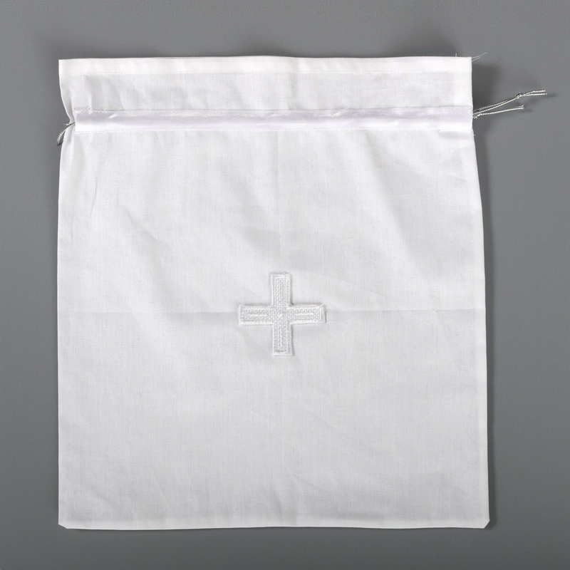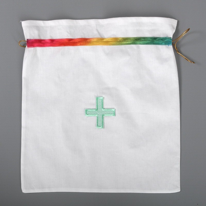 Крестильный мешочек для хранения крестильных изделий. Изготовленный из натуральной однотонной ткани. Декорированный вышитым крестом. Сверху завязки-кулиска.
