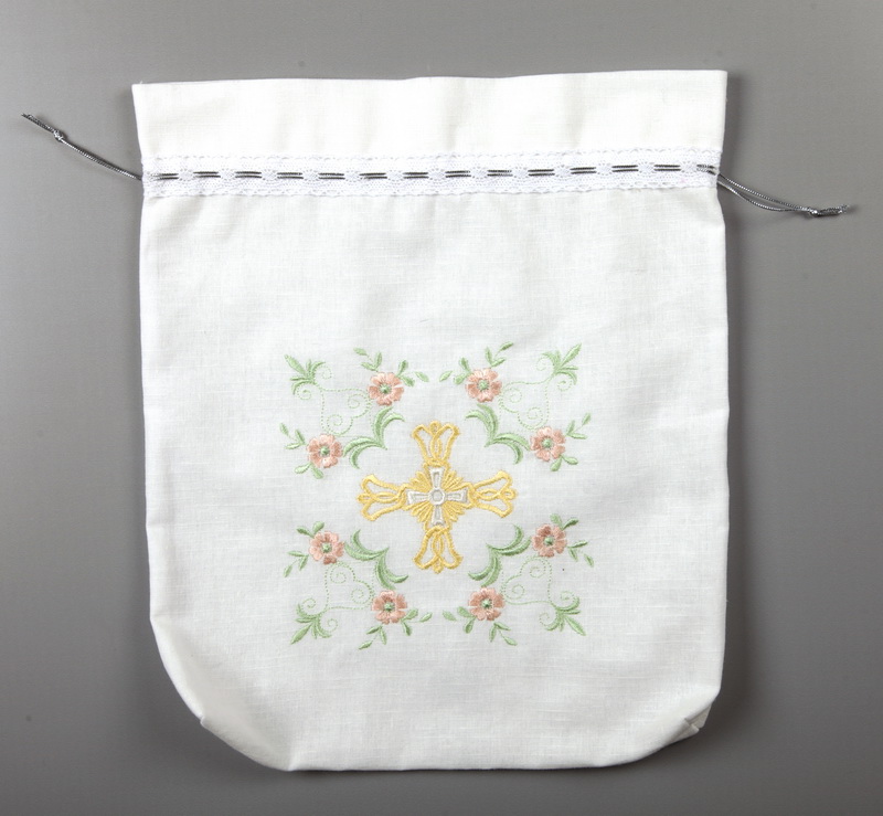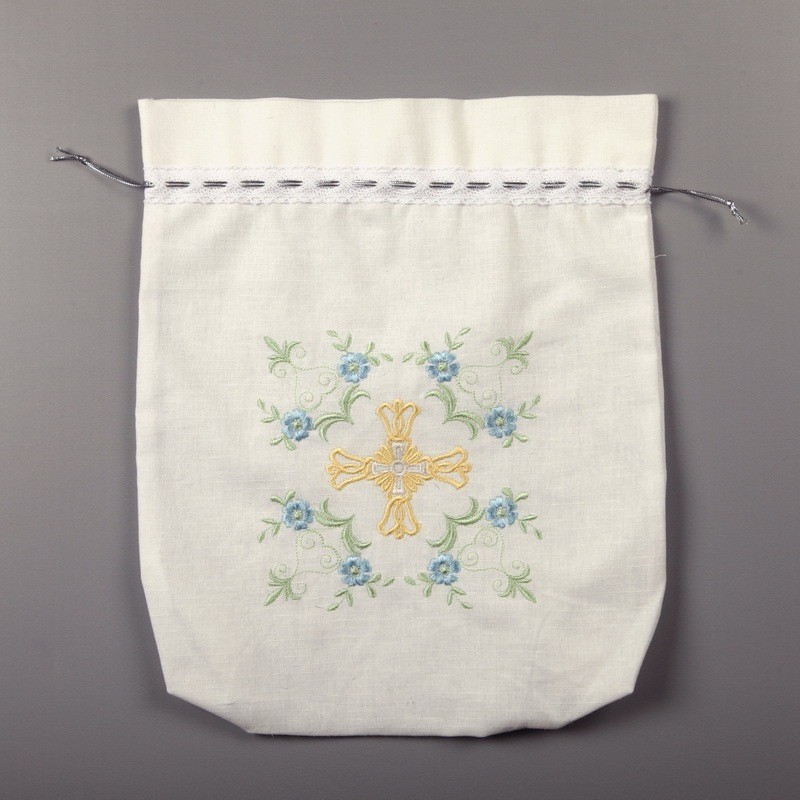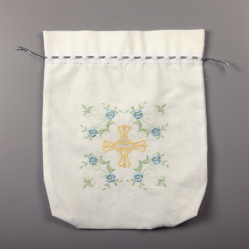 Крестильный мешочек для хранения крестильных изделий. Изготовленный из натуральной однотонной ткани. Декорированный автоматической вышивкой и кружевом. Сверху завязки-кулиска.