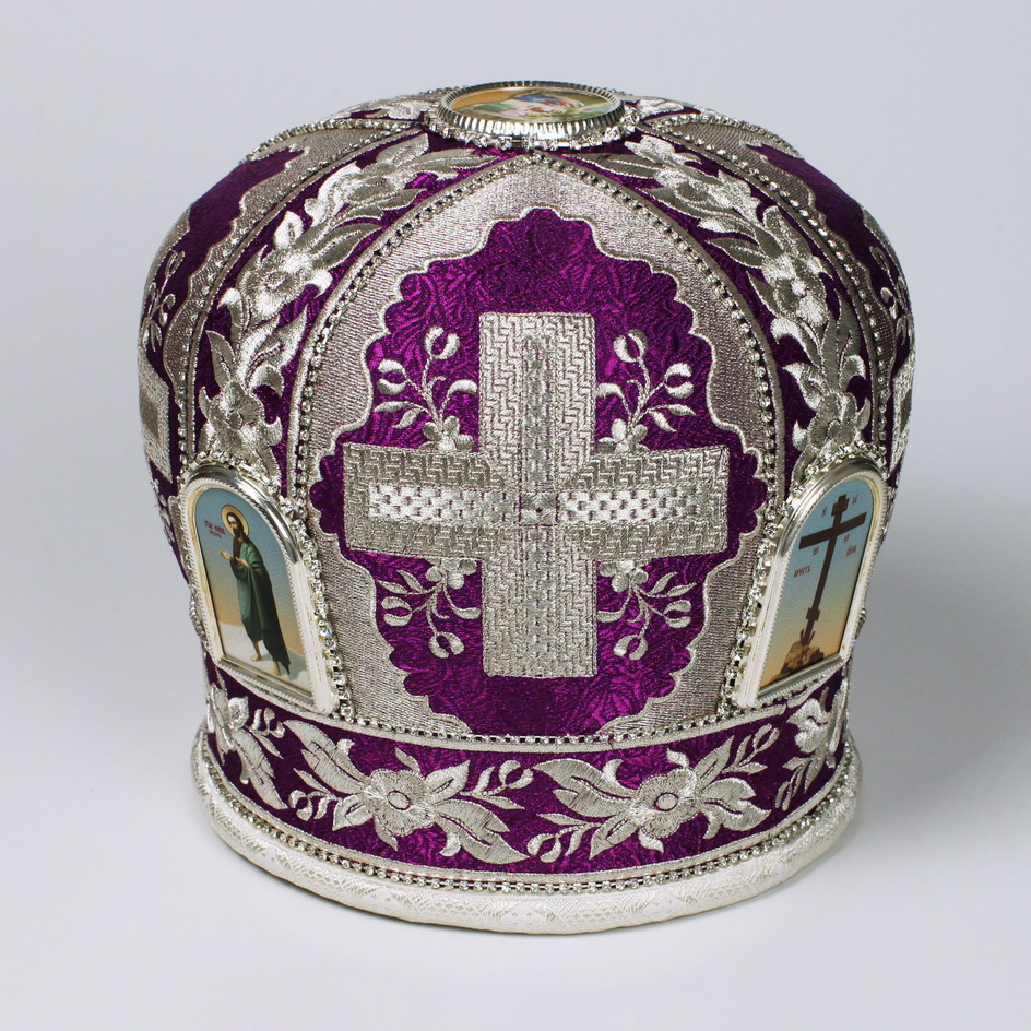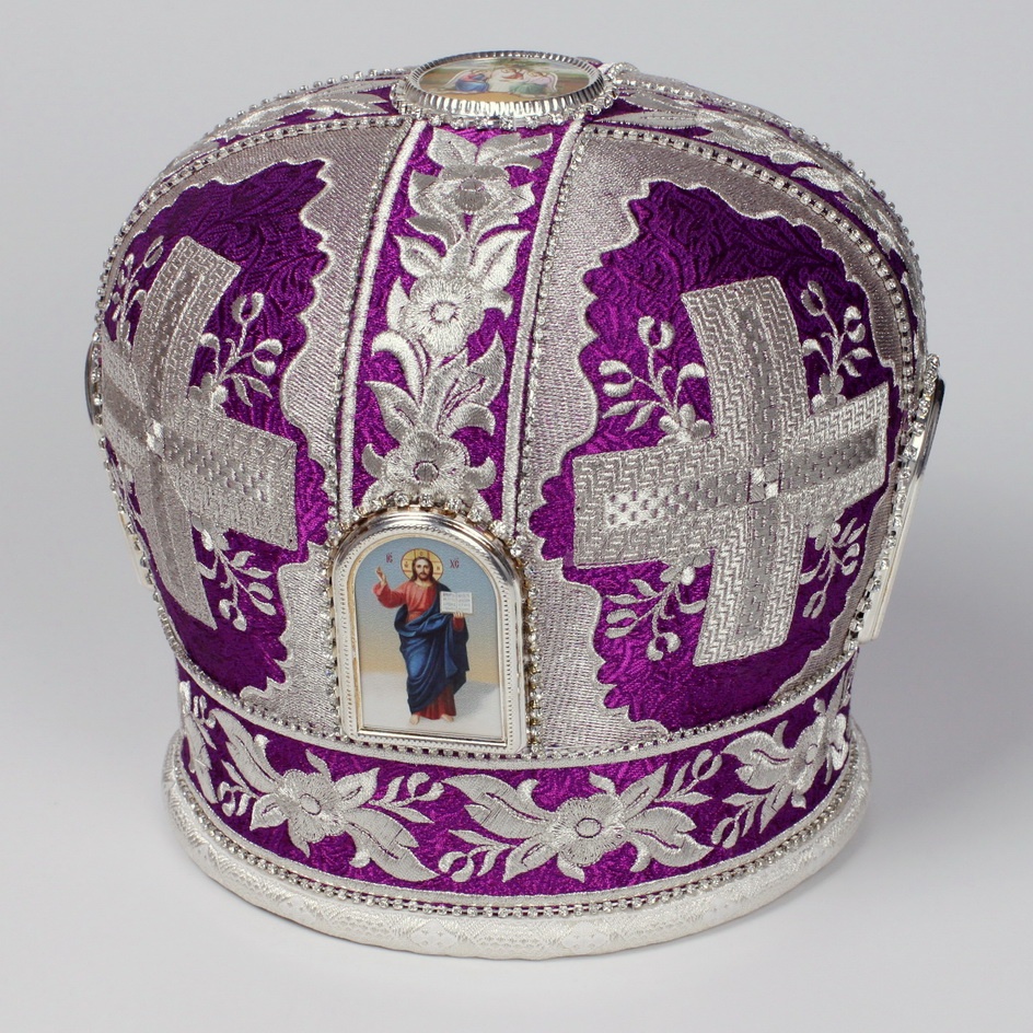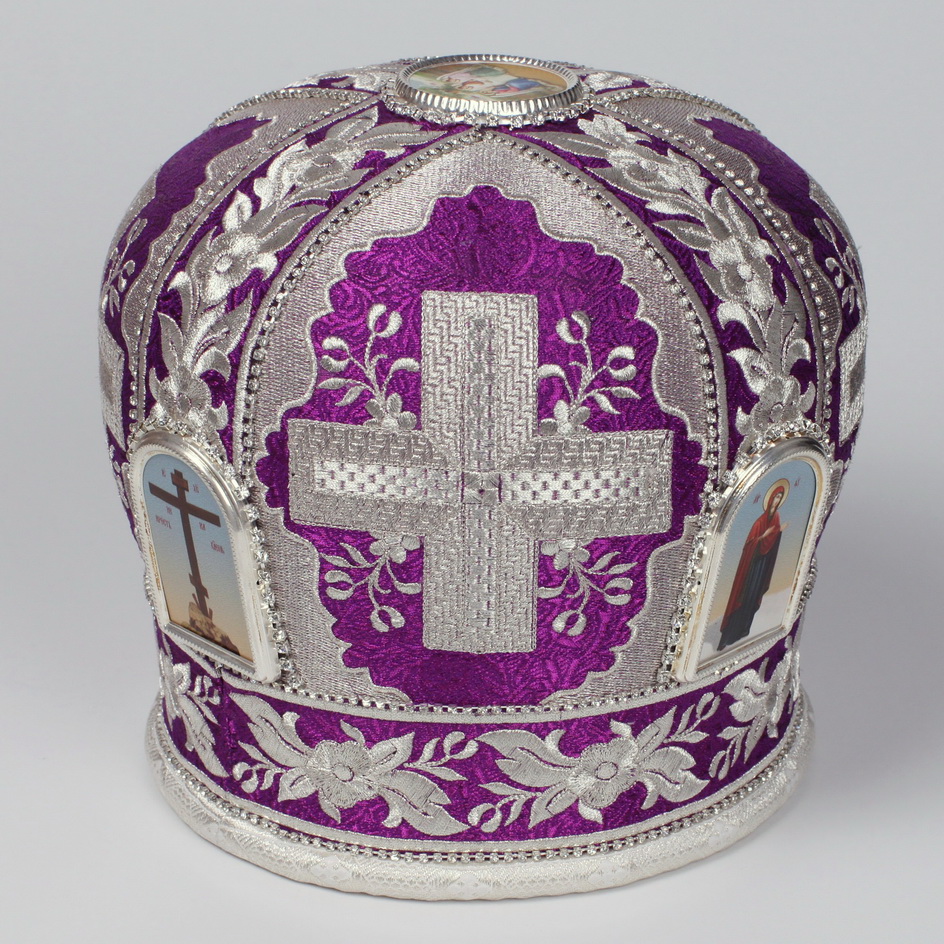 фиолетовая митра по акции размер 61. Митра выполнена из фактурного глазета.