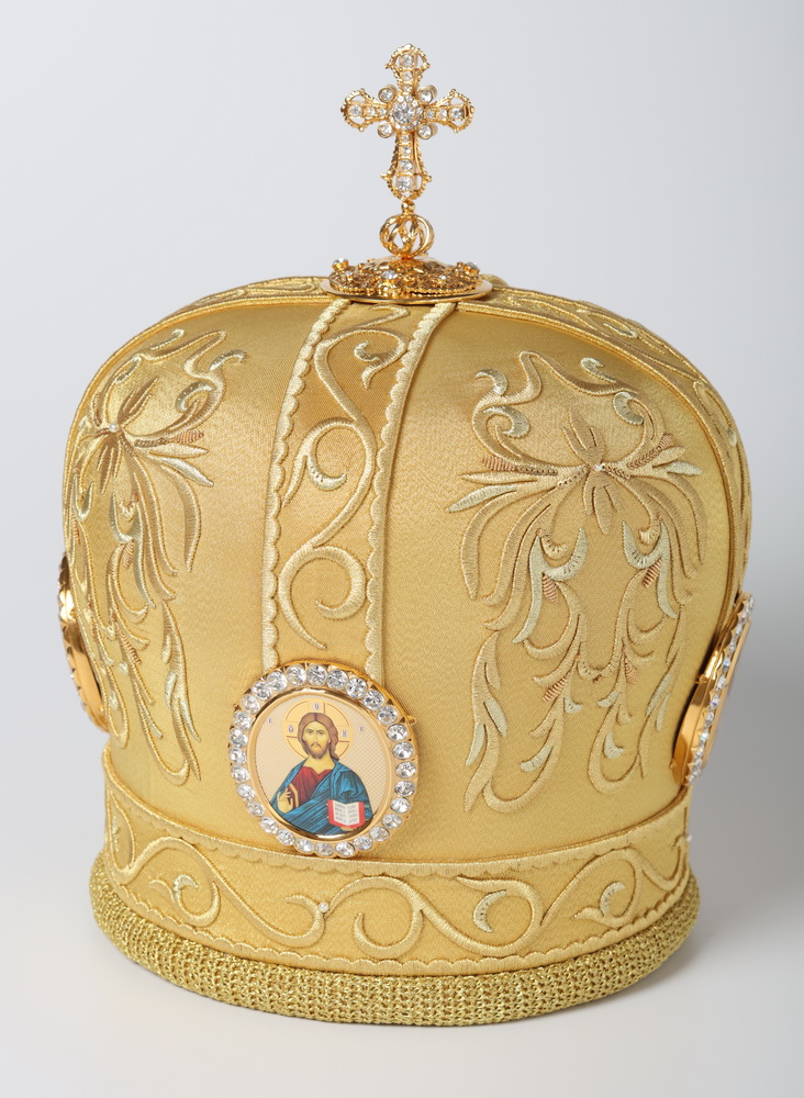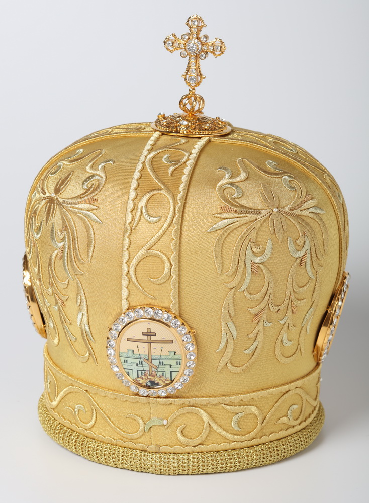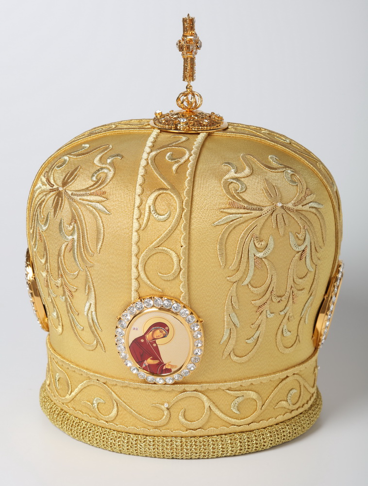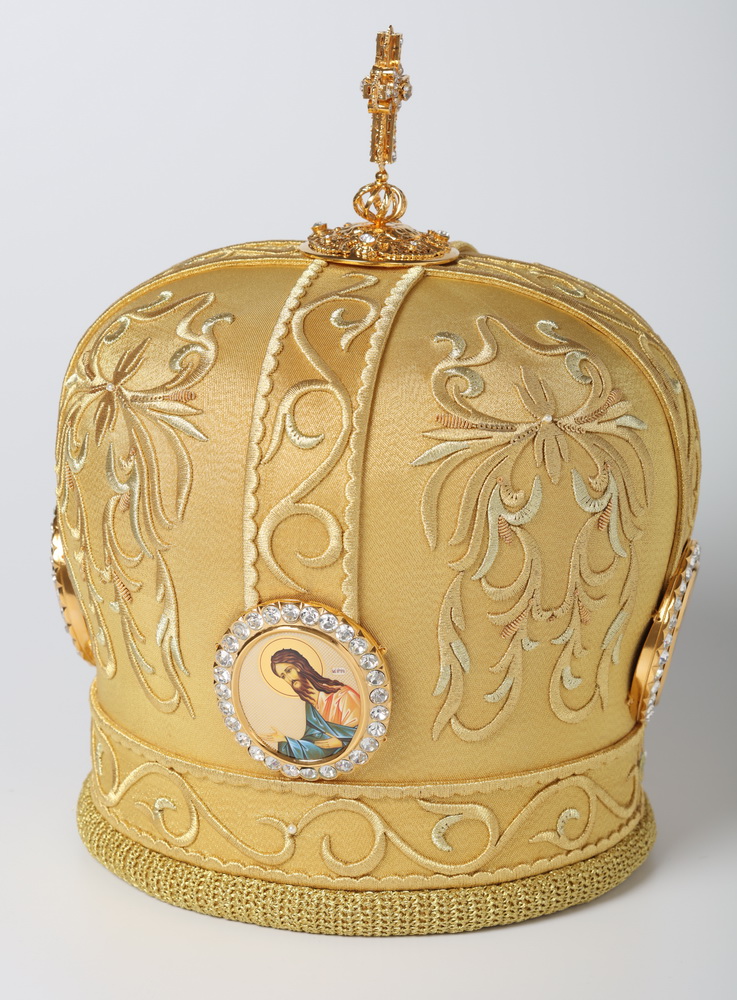 Митра с ручной вышивкой, выполнена из импортного гладкого глазета.