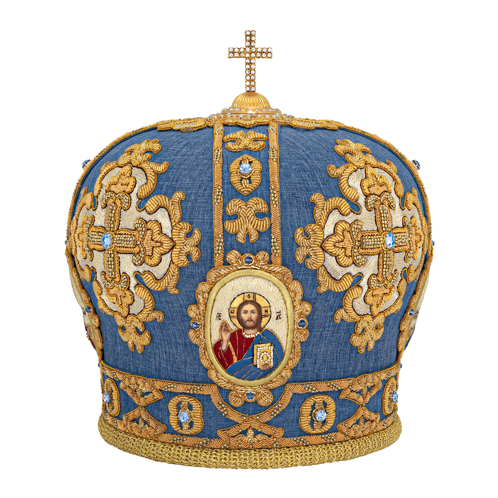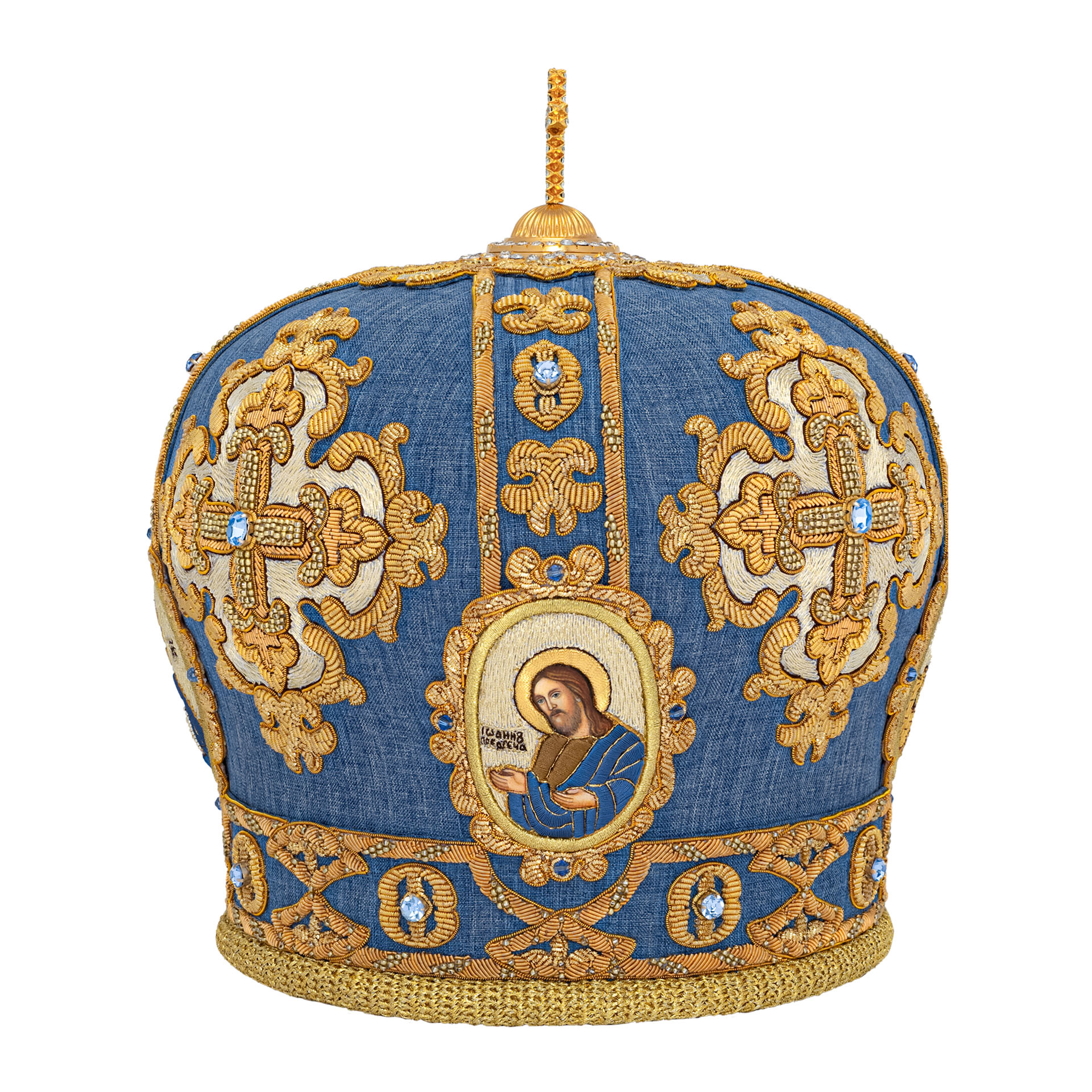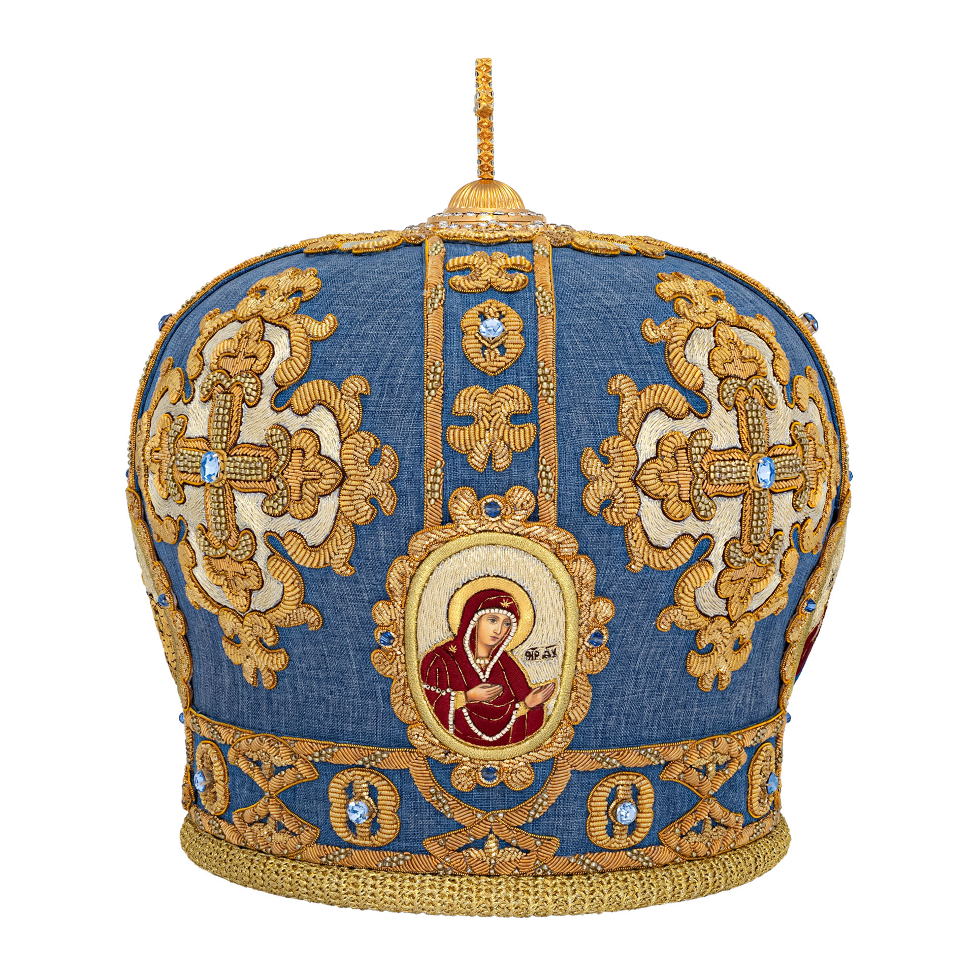 Митра ручная вышивка №551 габардин,канитель, юв.камни,лики вышитые 4 шт.,юв.крест , футляр(п) голубой {{variant.name}}