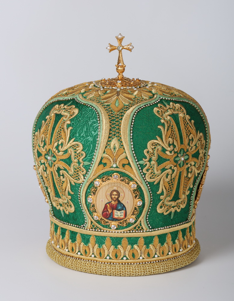 Митра с ручной вышивкой, выполнена из фактурного глазета.