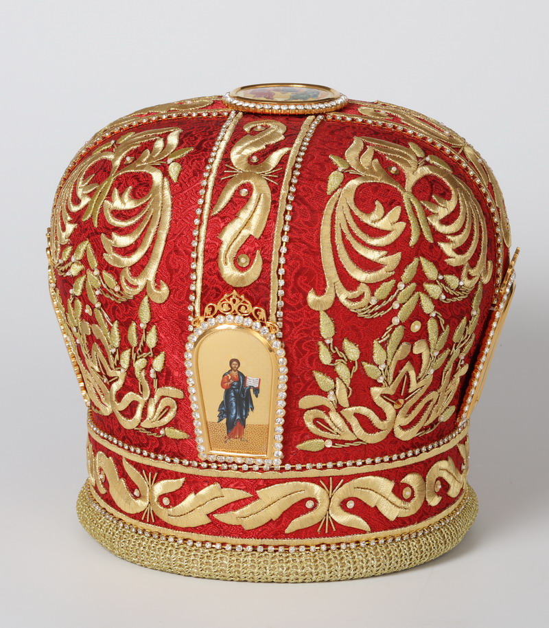 Митра с ручной вышивкой, выполнена из фактурного глазета.