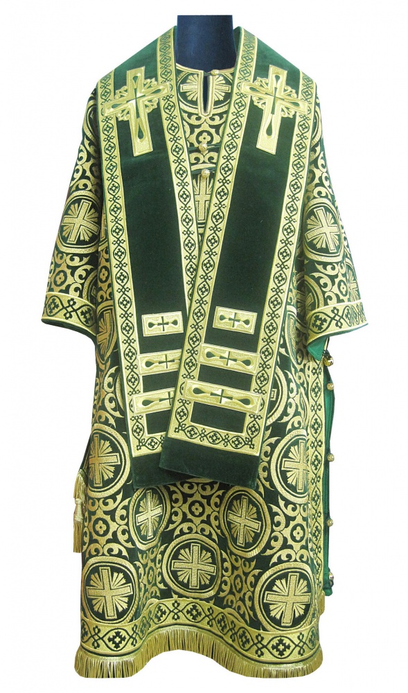 В комплект входит 8 предметов: саккос, епитрахиль, поручи, пояс, большой омофор, малый омофор, палица, сулок.