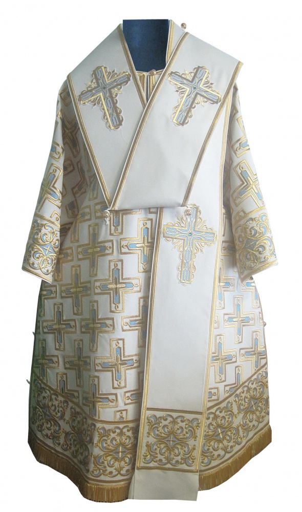 Архиерейское облачение, выполненное из натуральной костюмной ткани. В комплект входит 8 предметов: саккос, епитрахиль, поручи, пояс, большой омофор, малый омофор, палица, сулок.