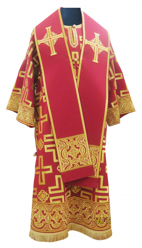 Архиерейское облачение, выполненное из натуральной костюмной ткани. В комплект входит 8 предметов: саккос, епитрахиль, поручи, пояс, большой омофор, малый омофор, палица, сулок.