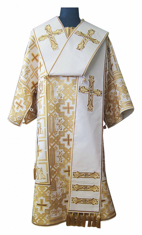 Архиерейское облачение, выполненное из натуральной костюмной ткани. В комплект входит 8 предметов: саккос, епитрахиль, поручи, пояс, большой омофор, малый омофор, палица, сулок.