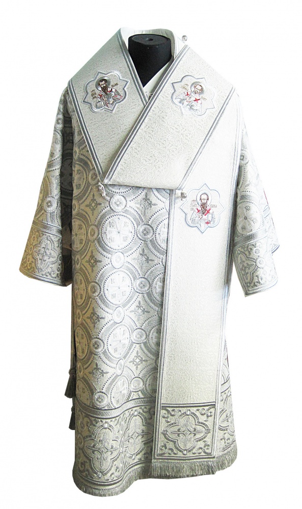 Архиерейское облачение, выполненное из глазета. В комплект входит 8 предметов: саккос, епитрахиль, поручи, пояс, большой омофор, малый омофор, палица, сулок.