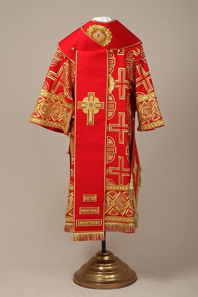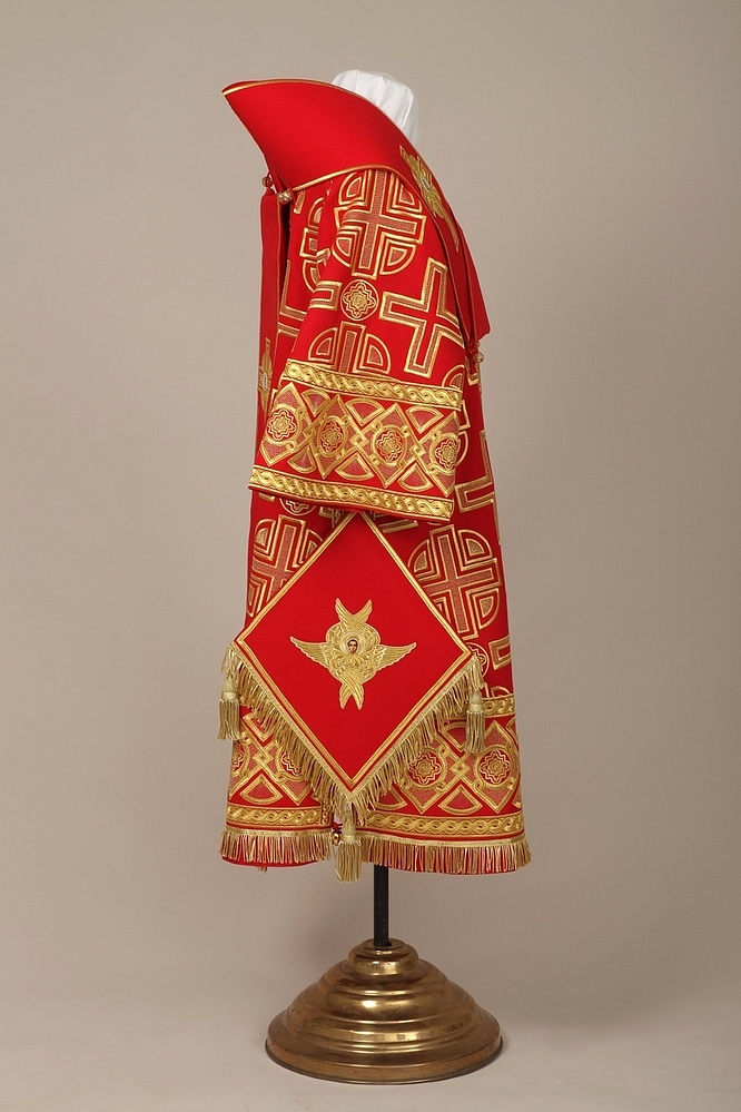 Архиерейское облачение, выполненное из натуральной костюмной ткани. В комплект входит 8 предметов: саккос, епитрахиль, поручи, пояс, большой омофор, малый омофор, палица, сулок.