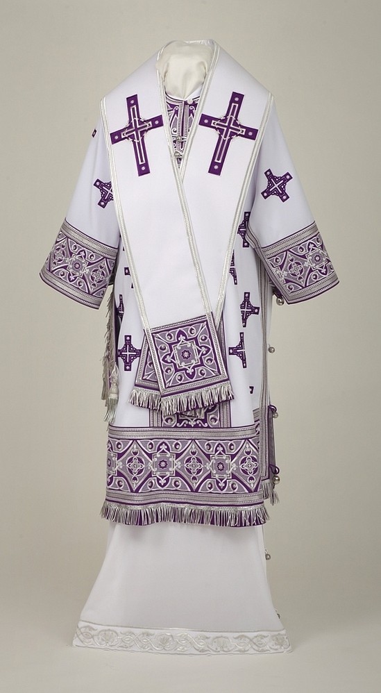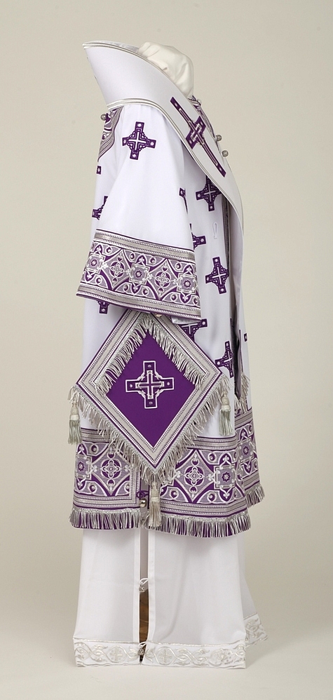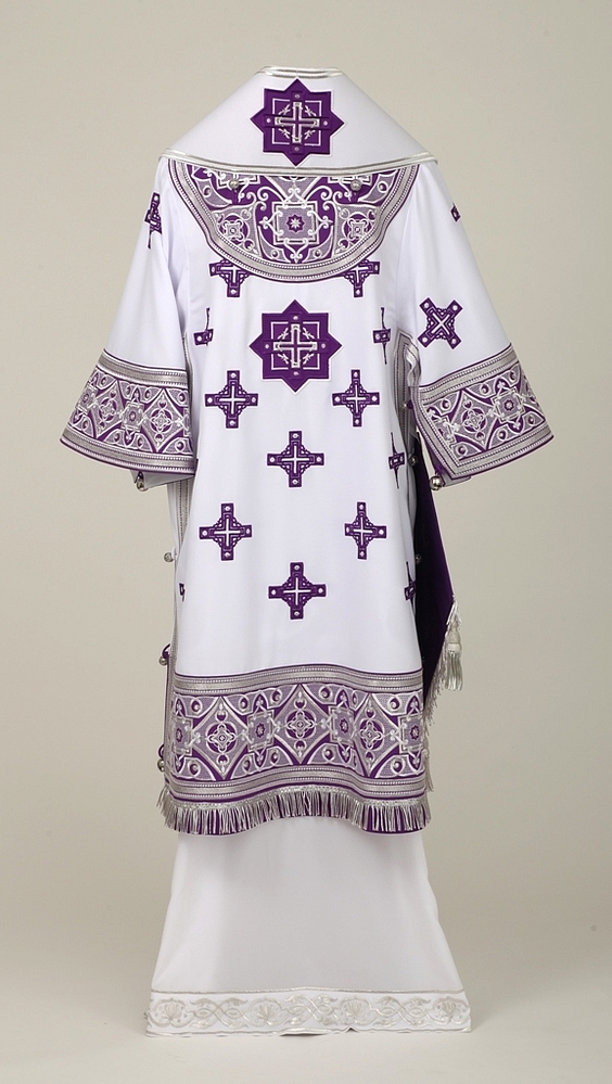 Архиерейское облачение, выполненное из габардина. В комплект входит 8 предметов: саккос, епитрахиль, поручи, пояс, большой омофор, малый омофор, палица, сулок.