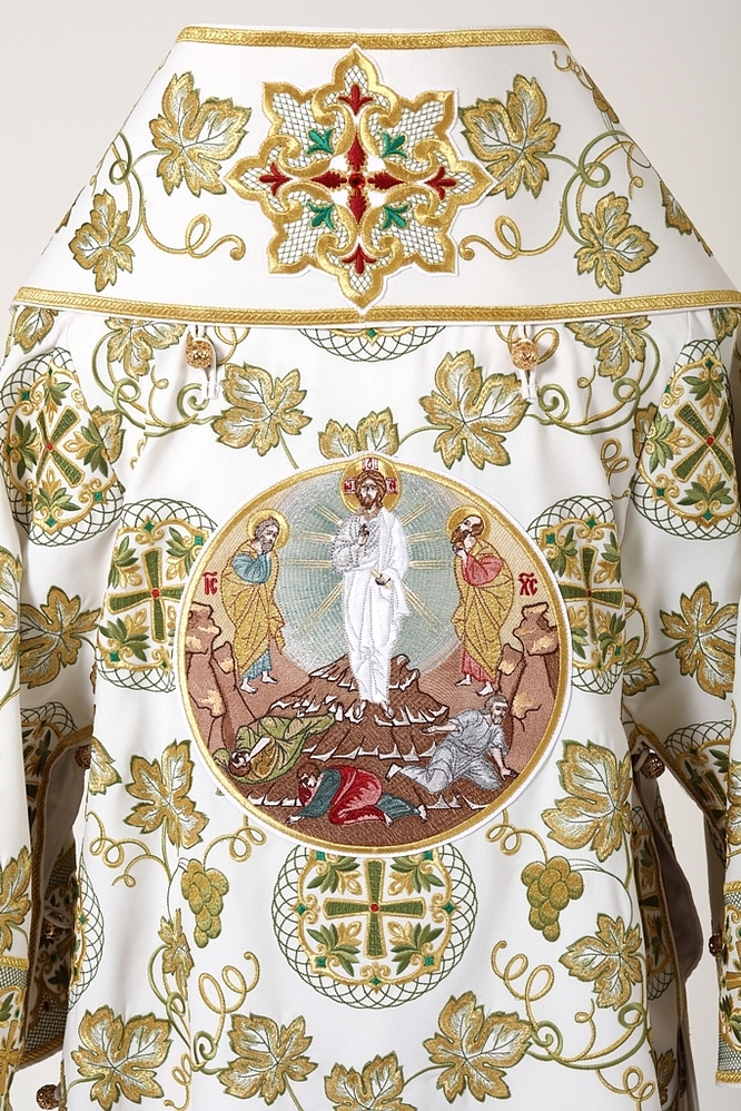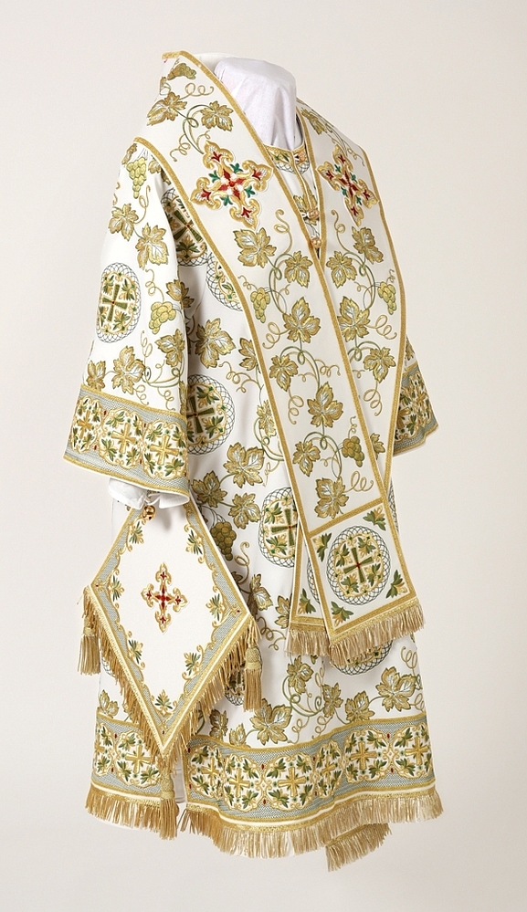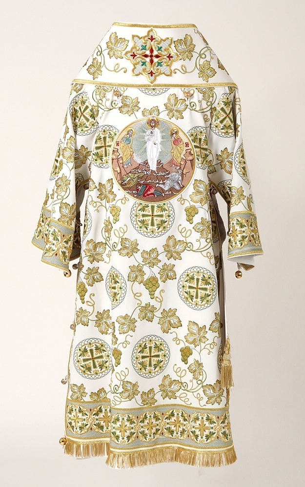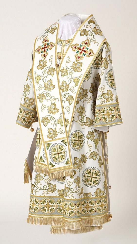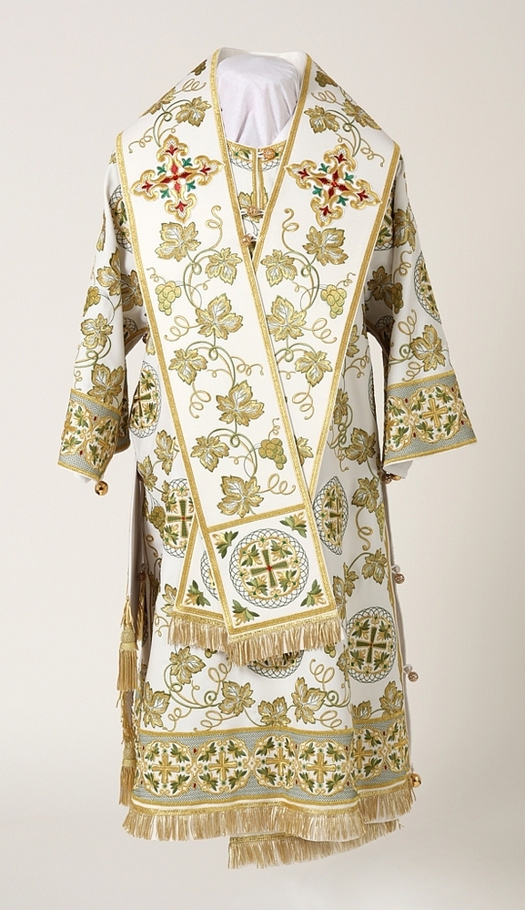 Архиерейское облачение, выполненное из натуральной костюмной ткани. В комплект входит 8 предметов: саккос, епитрахиль, поручи, пояс, большой омофор, малый омофор, палица, сулок.
