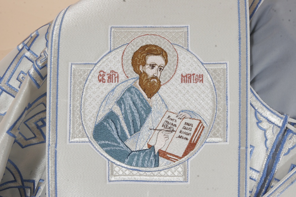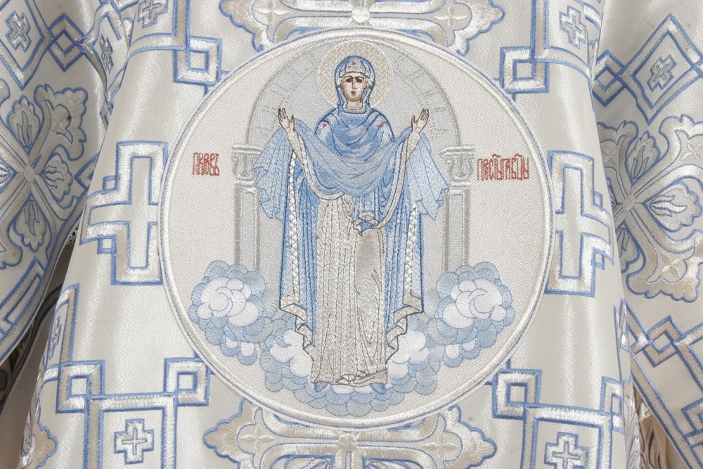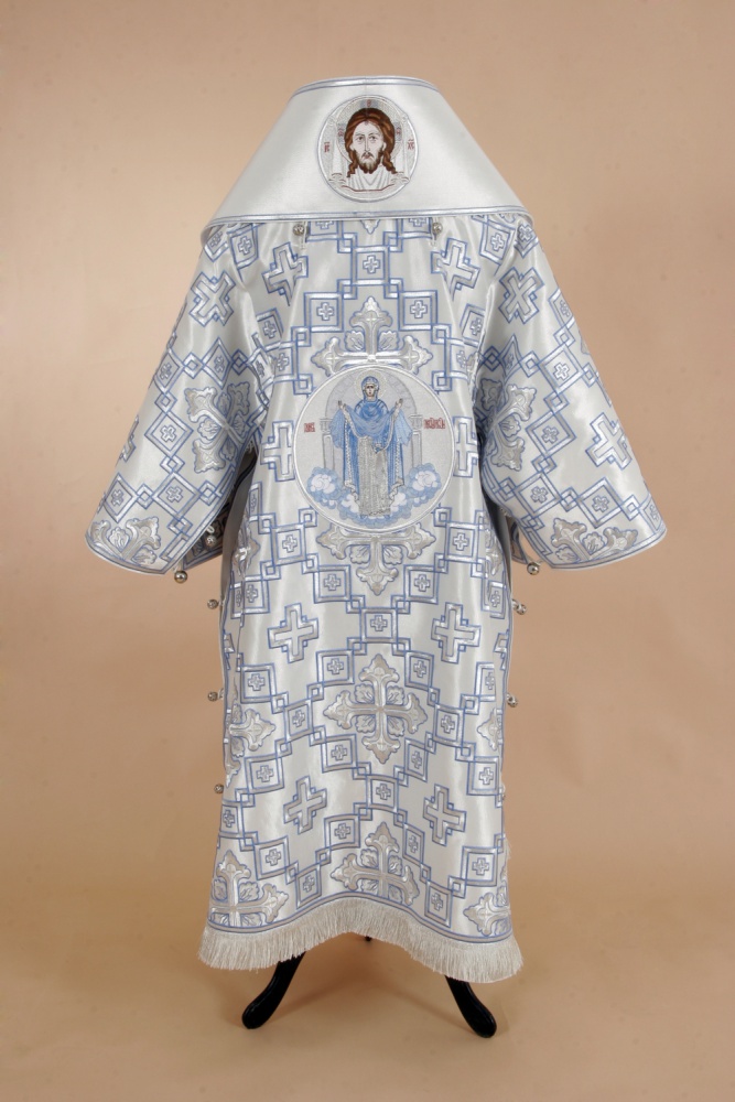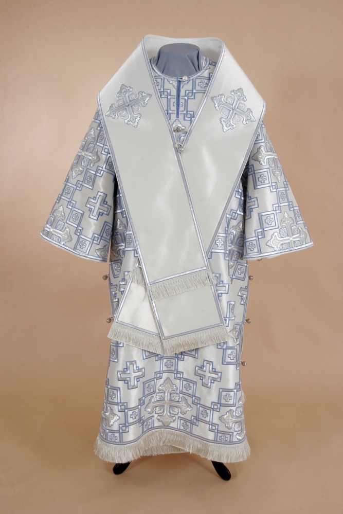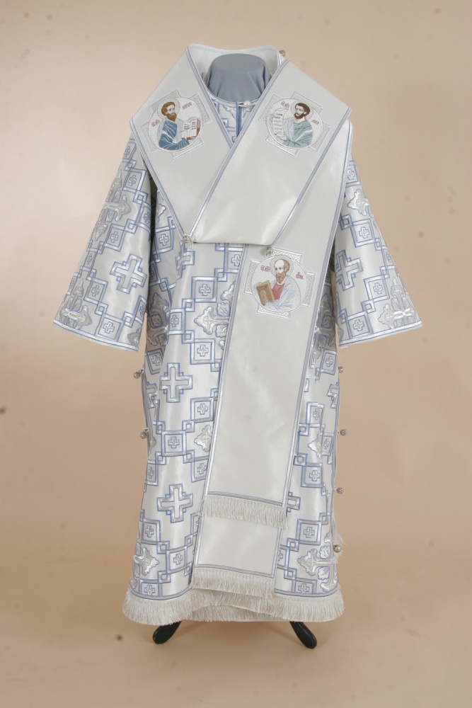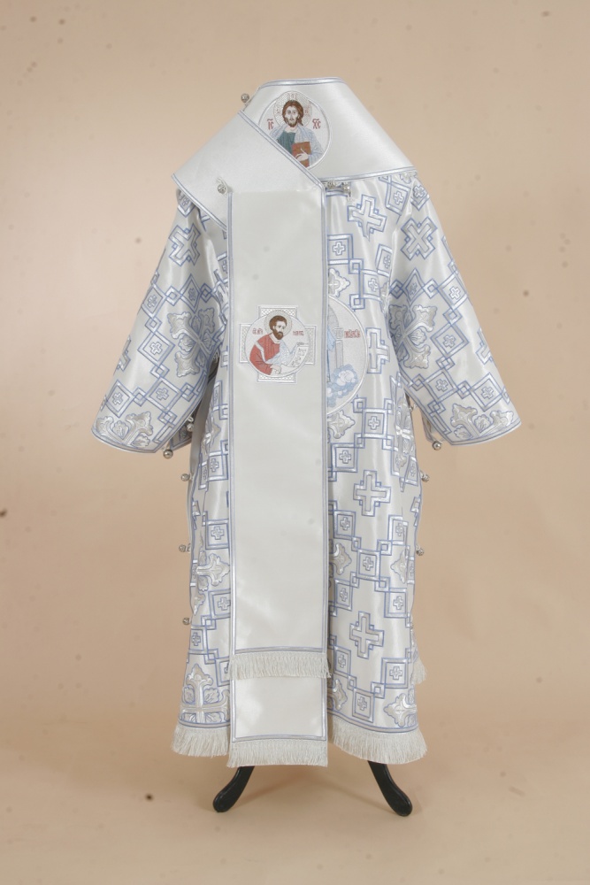 Архиерейское облачение, выполненное из греческого глазета. В комплект входит 8 предметов: саккос, епитрахиль, поручи, пояс, большой омофор, малый омофор, палица, сулок.