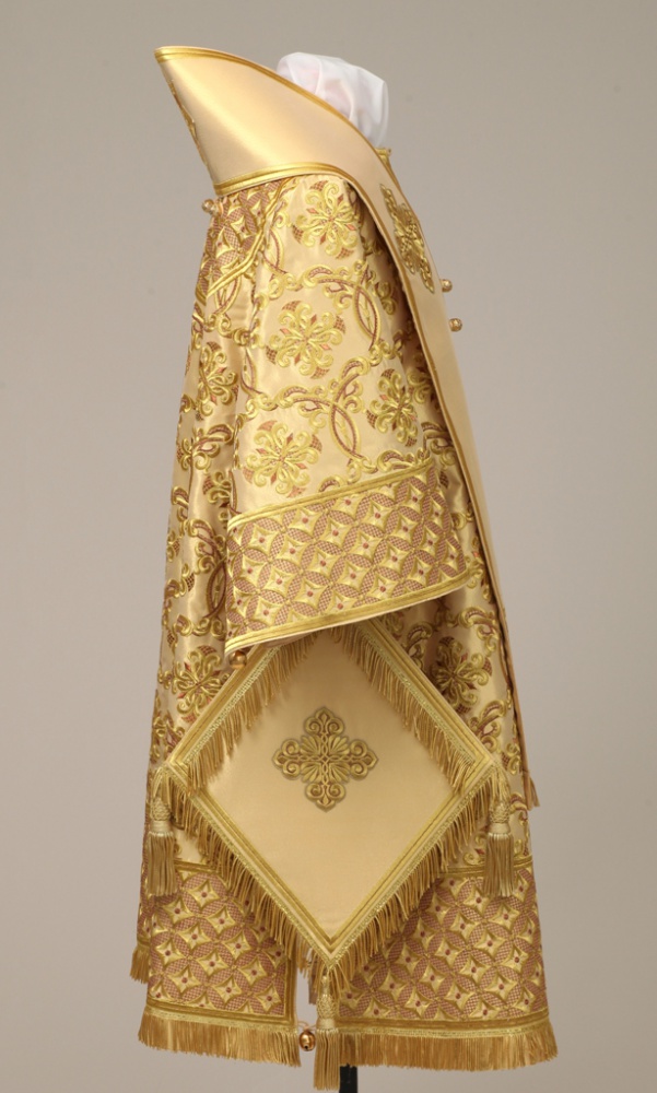 Архиерейское облачение, выполненное из греческого глазета. В комплект входит 8 предметов: саккос, епитрахиль, поручи, пояс, большой омофор, малый омофор, палица, сулок.