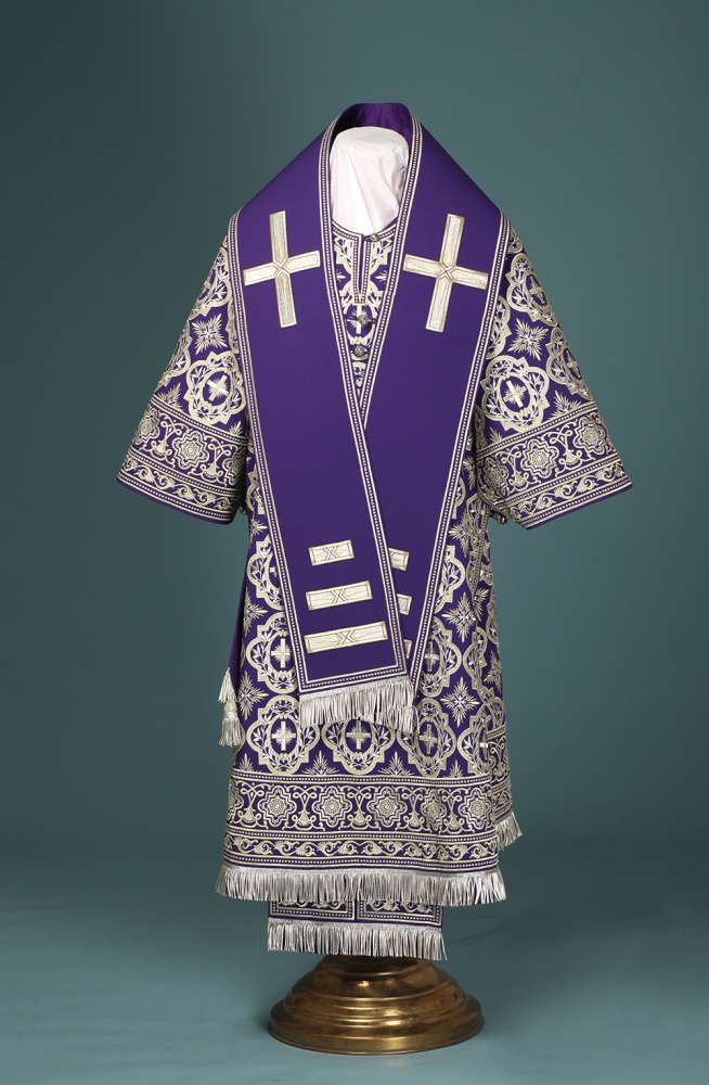 Архиерейское облачение, выполненное из натуральной костюмной ткани. В комплект входит 8 предметов: саккос, епитрахиль, поручи, пояс, большой омофор, малый омофор, палица, сулок.