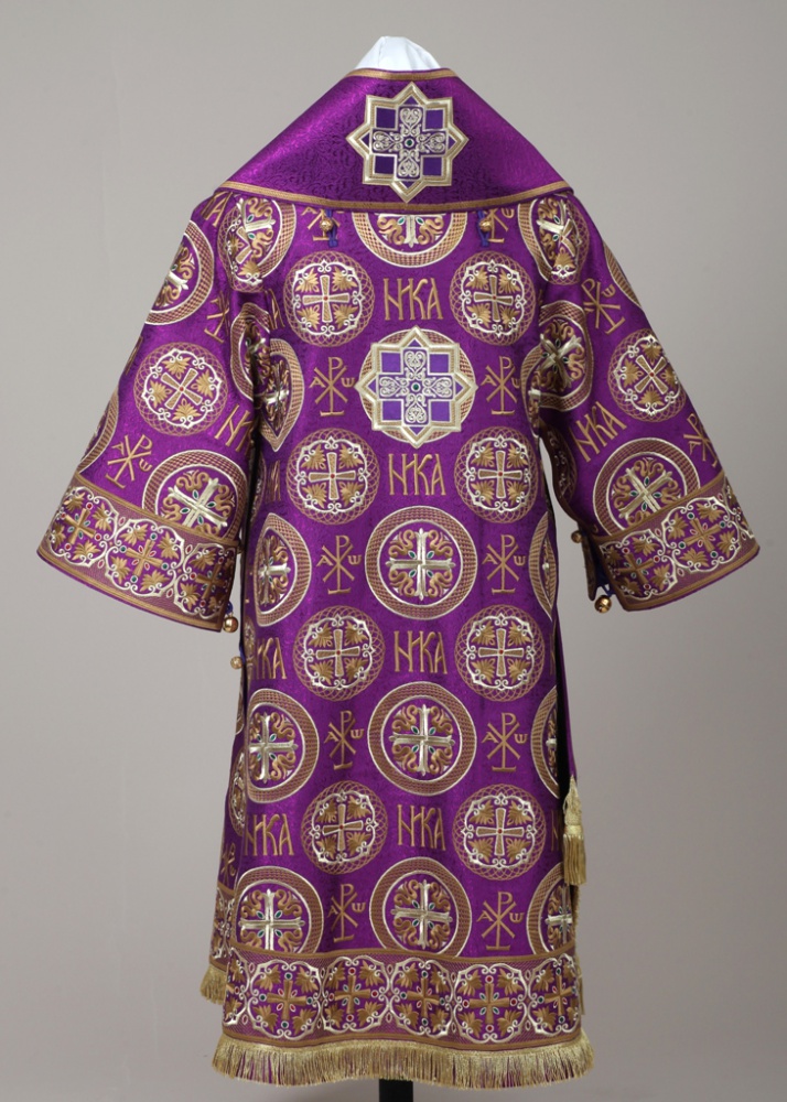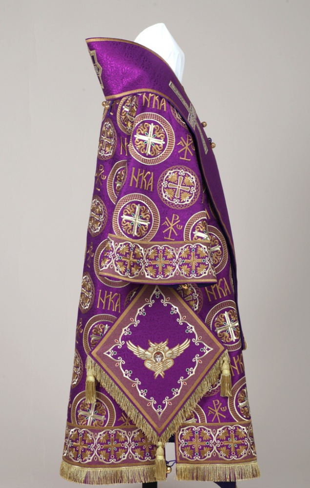 Архиерейское облачение, выполненное из глазета. В комплект входит 8 предметов: саккос, епитрахиль, поручи, пояс, большой омофор, малый омофор, палица, сулок. Состав материала: 37% вискоза, 23% полиэстер, 40% метонить. Отделочные элементы: автоматическая вышивка, галун, кресты, бахрома. Доступно исполнение во всех богослужебных цветах. По Вашему желанию мы можем внести изменения в отделку или заменить материал. К исполнению доступны все размеры. Подсакосник заказывается отдельно. Рекомендация по уходу за изделием: сухая химическая чистка .