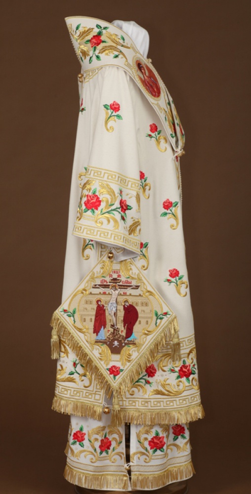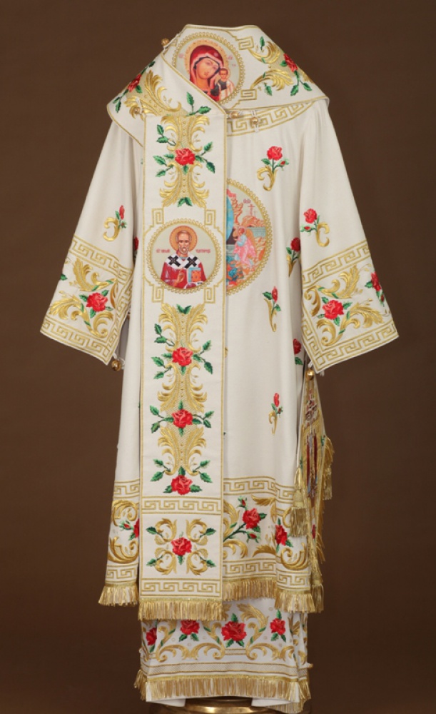 Архиерейское облачение, выполненное из натурального "дикого" шелка. В комплект входит 8 предметов: саккос, епитрахиль, поручи, пояс, большой омофор, малый омофор, палица, сулок. Состав материала: 37% вискоза, 23% полиэстер, 40% метонить. Отделочные элементы: автоматическая вышивка, галун, кресты, бахрома, вышитые иконы. Доступно исполнение во всех богослужебных цветах. По Вашему желанию мы можем внести изменения в отделку или заменить материал. К исполнению доступны все размеры. Подсакосник заказывается отдельно. Рекомендация по уходу за изделием: сухая химическая чистка .