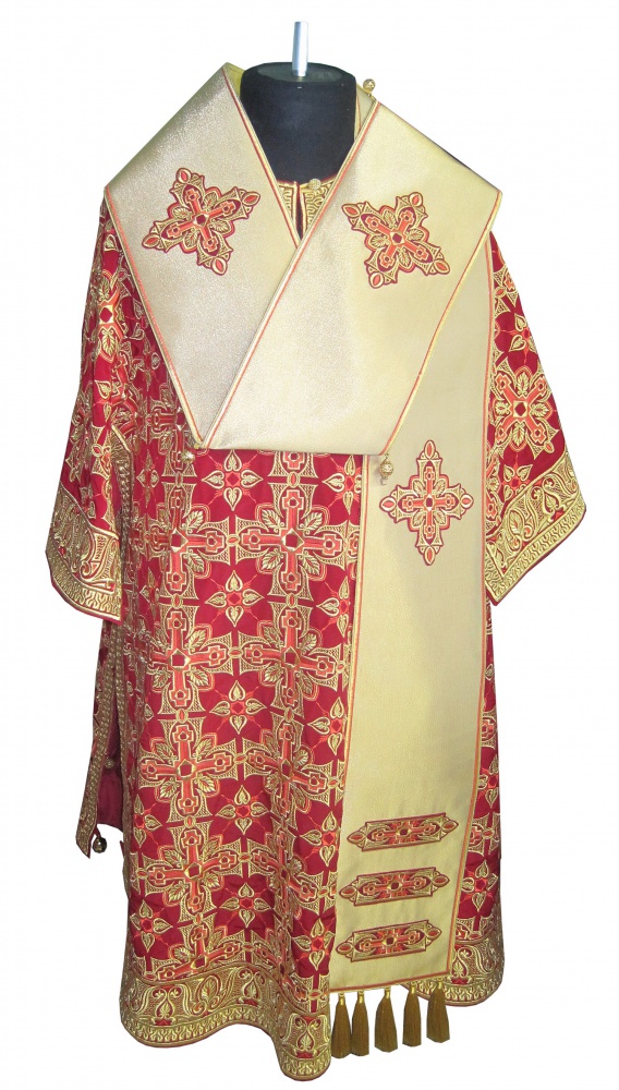 Архиерейское облачение, выполненное из натуральной костюмной ткани. В комплект входит 8 предметов: саккос, епитрахиль, поручи, пояс, большой омофор, малый омофор, палица, сулок. Состав материала: 80% шерсть, 20% полиэстер. Отделочные элементы: автоматическая вышивка, галун, кресты, кисти. Доступно исполнение во всех богослужебных цветах. По Вашему желанию мы можем внести изменения в отделку или заменить материал. К исполнению доступны все размеры. Подсакосник заказывается отдельно. Рекомендация по уходу за изделием: сухая химическая чистка .
