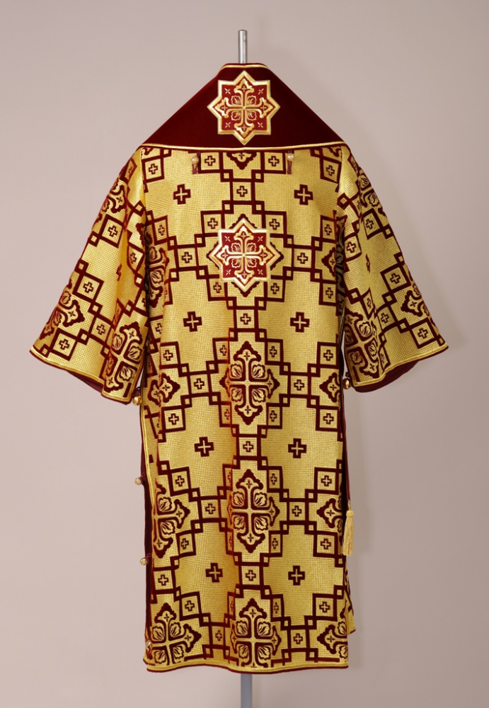 Архиерейское облачение, выполненное из натурального немецкого бархата. В комплект входит 8 предметов: саккос, епитрахиль, поручи, пояс, большой омофор, малый омофор, палица, сулок. Состав материала: 100% хлопок (Германия). Отделочные элементы: автоматическая вышивка, галун, кресты. Доступно исполнение во всех богослужебных цветах. По Вашему желанию мы можем внести изменения в отделку или заменить материал. К исполнению доступны все размеры. Подсакосник заказывается отдельно. Рекомендация по уходу за изделием: сухая химическая чистка .