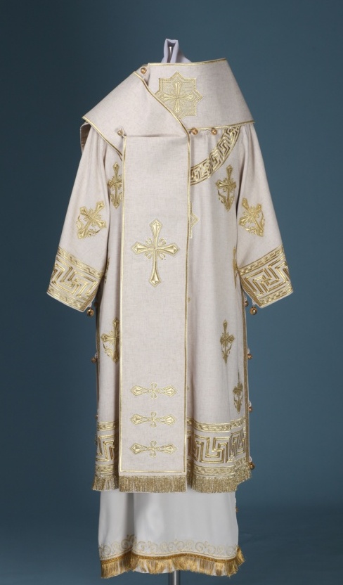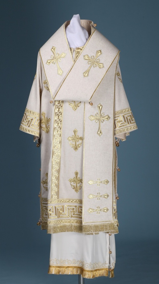 Архиерейское облачение, выполненное из натурального немецкого бархата. В комплект входит 8 предметов: саккос, епитрахиль, поручи, пояс, большой омофор, малый омофор, палица, сулок. Состав материала: 100% лен. Отделочные элементы: автоматическая вышивка, галун, кресты, бахрома. Доступно исполнение во всех богослужебных цветах. По Вашему желанию мы можем внести изменения в отделку или заменить материал. К исполнению доступны все размеры. Подсакосник заказывается отдельно. Рекомендация по уходу за изделием: сухая химическая чистка .