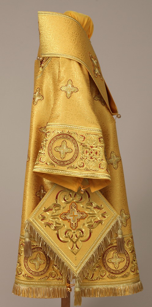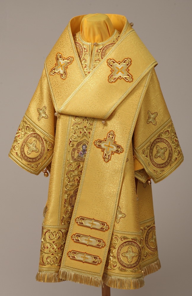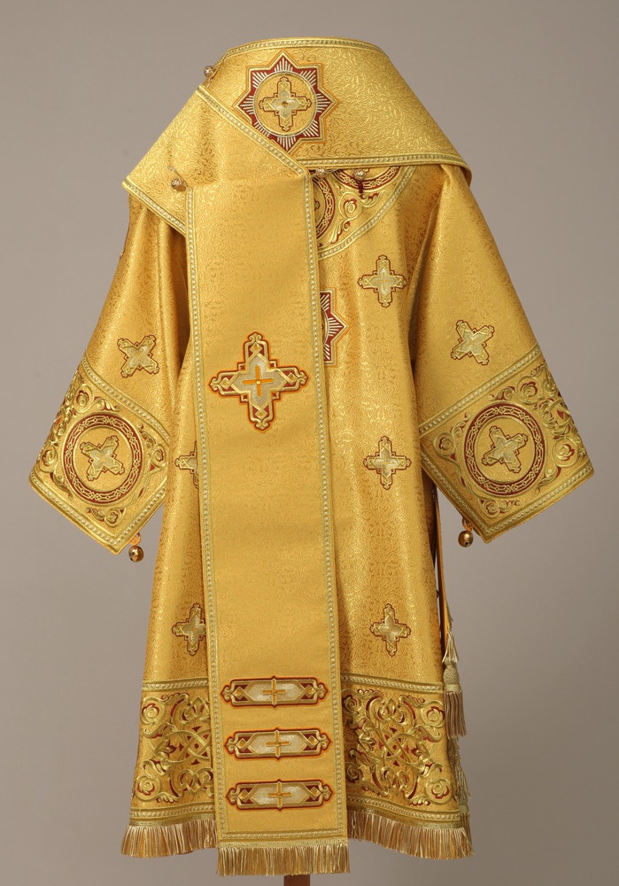 Архиерейское облачение, выполненное из глазета. В комплект входит 8 предметов: саккос, епитрахиль, поручи, пояс, большой омофор, малый омофор, палица, сулок. Состав материала: 37% вискоза, 23% полиэстер, 40% метонить. Отделочные элементы: автоматическая вышивка, галун, кресты, бахрома. Доступно исполнение во всех богослужебных цветах. По Вашему желанию мы можем внести изменения в отделку или заменить материал. К исполнению доступны все размеры. Подсакосник заказывается отдельно. Рекомендация по уходу за изделием: сухая химическая чистка .
