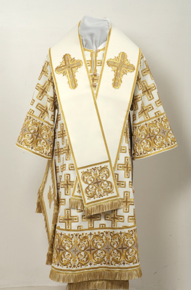 Архиерейское облачение, выполненное из натуральной костюмной ткани. В комплект входит 8 предметов: саккос, епитрахиль, поручи, пояс, большой омофор, малый омофор, палица, сулок. Состав материала: 80% шерсть, 20% полиэстер. Отделочные элементы: автоматическая вышивка, галун, кресты, бахрома. Доступно исполнение во всех богослужебных цветах. По Вашему желанию мы можем внести изменения в отделку или заменить материал. К исполнению доступны все размеры. Подсакосник заказывается отдельно. Рекомендация по уходу за изделием: сухая химическая чистка .