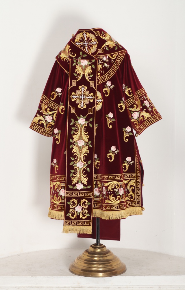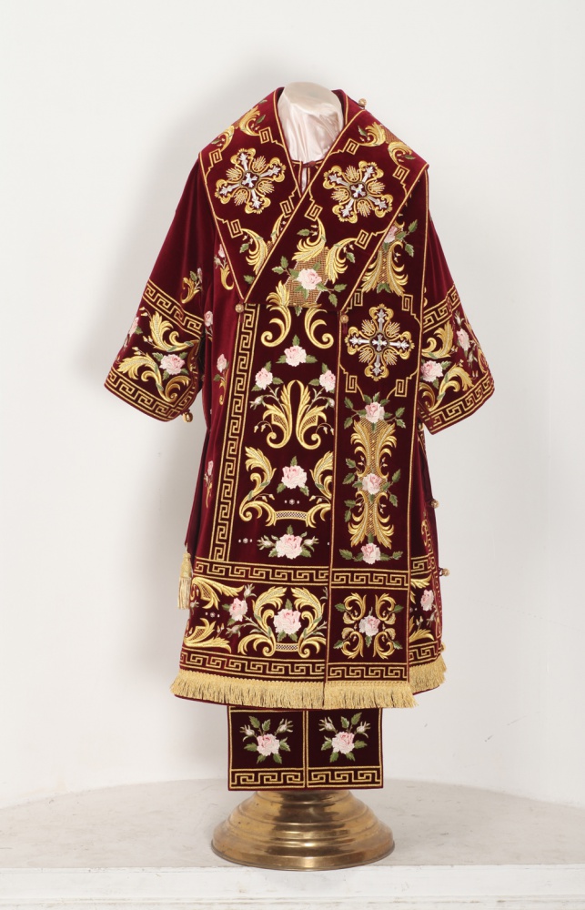 Архиерейское облачение, выполненное из натурального немецкого бархата. В комплект входит 8 предметов: саккос, епитрахиль, поручи, пояс, большой омофор, малый омофор, палица, сулок. Состав материала: 100% хлопок (Германия). Отделочные элементы: автоматическая вышивка, галун, кресты, бахрома. Доступно исполнение во всех богослужебных цветах. По Вашему желанию мы можем внести изменения в отделку или заменить материал. К исполнению доступны все размеры. Подсакосник заказывается отдельно. Рекомендация по уходу за изделием: сухая химическая чистка .