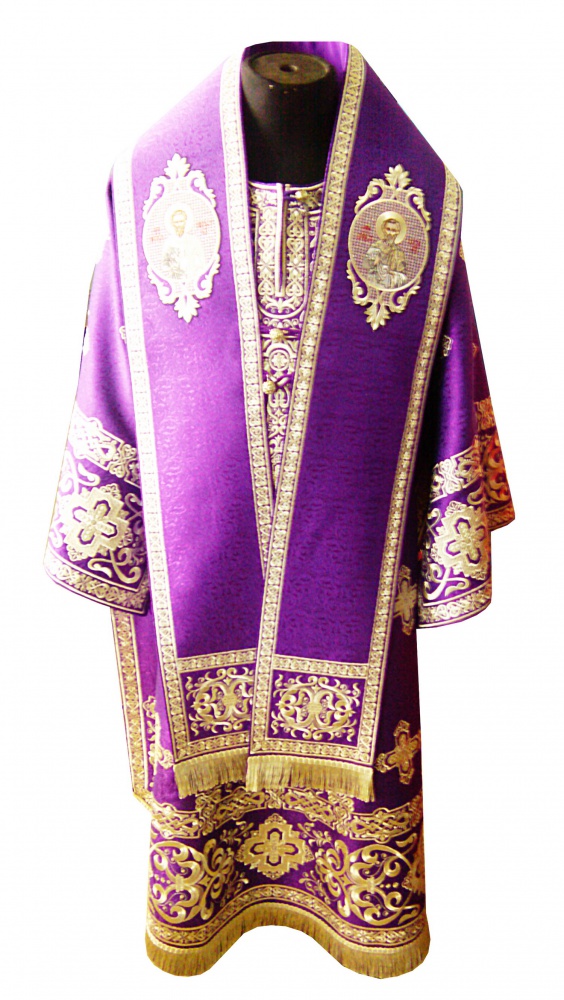 Архиерейское облачение, выполненное из глазета. В комплект входит 8 предметов: саккос, епитрахиль, поручи, пояс, большой омофор, малый омофор, палица, сулок. Состав материала: 37% вискоза, 23% полиэстер, 40% метонить. Отделочные элементы: автоматическая вышивка, галун, кресты, вышитые иконы, бахрома. Доступно исполнение во всех богослужебных цветах. По Вашему желанию мы можем внести изменения в отделку или заменить материал. К исполнению доступны все размеры. Подсакосник заказывается отдельно. Рекомендация по уходу за изделием: сухая химическая чистка .