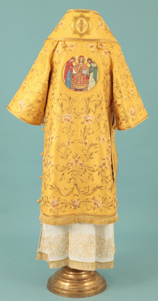 Архиерейское облачение, выполненное из глазета. В комплект входит 8 предметов: саккос, епитрахиль, поручи, пояс, большой омофор, малый омофор, палица, сулок. Состав материала: 37% вискоза, 23% полиэстер, 40% метонить. Отделочные элементы: автоматическая вышивка, галун, кресты, бахрома. Доступно исполнение во всех богослужебных цветах. По Вашему желанию мы можем внести изменения в отделку или заменить материал. К исполнению доступны все размеры. Подсакосник заказывается отдельно. Рекомендация по уходу за изделием: сухая химическая чистка