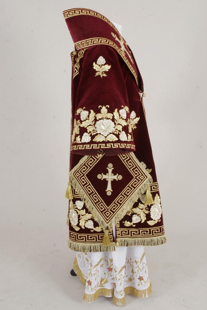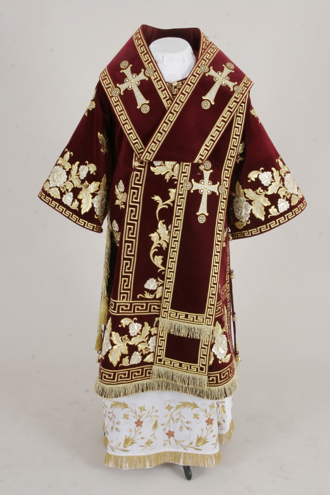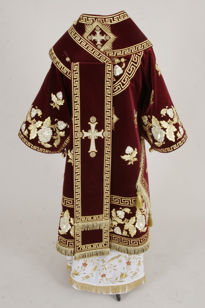 Архиерейское облачение, выполненное из натурального немецкого бархата. В комплект входит 8 предметов: саккос, епитрахиль, поручи, пояс, большой омофор, малый омофор, палица, сулок. Состав материала: 100% хлопок (Германия). Отделочные элементы: автоматическая вышивка, галун, кресты, бахрома. Доступно исполнение во всех богослужебных цветах. По Вашему желанию мы можем внести изменения в отделку или заменить материал. К исполнению доступны все размеры. Подсакосник заказывается отдельно. Рекомендация по уходу за изделием: сухая химическая чистка .