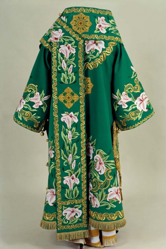 Архиерейское облачение, выполненное из шерсти. В комплект входит 8 предметов: саккос, епитрахиль, поручи, пояс, большой омофор, малый омофор, палица, сулок.