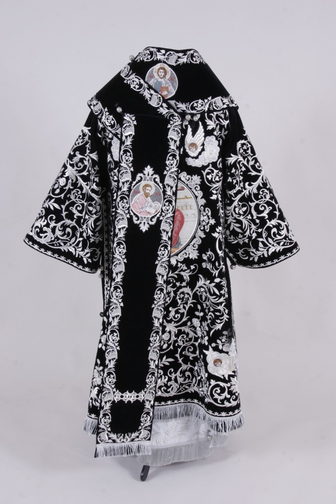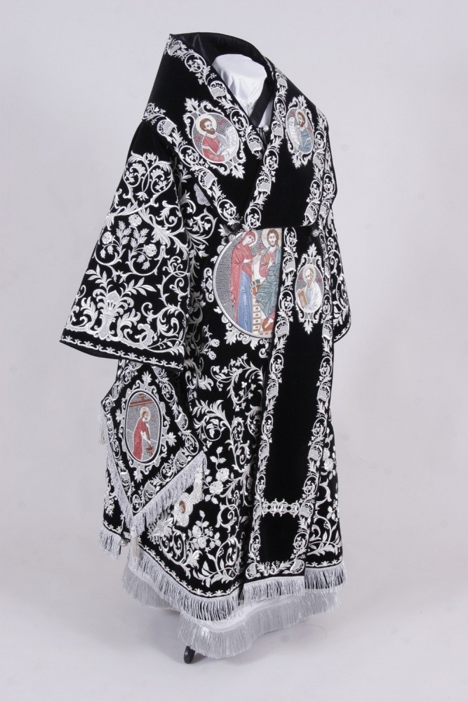 Архиерейское облачение, выполненное из натурального немецкого бархата. В комплект входит 8 предметов: саккос, епитрахиль, поручи, пояс, большой омофор, малый омофор, палица, сулок.
