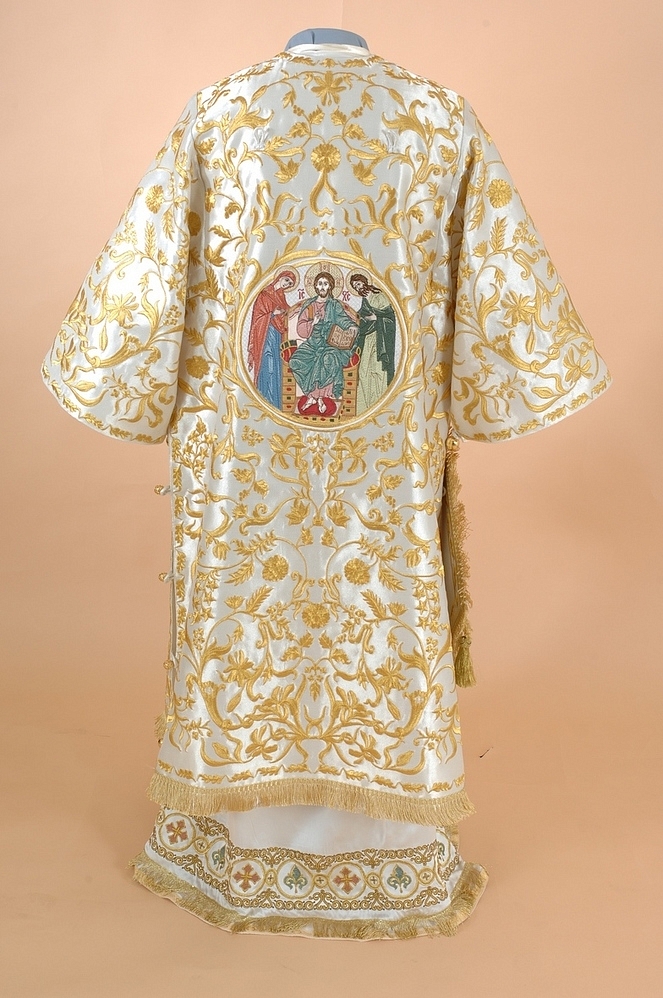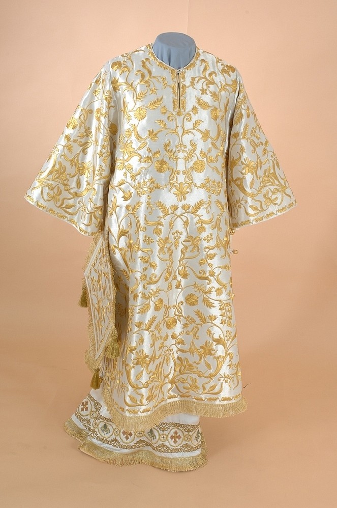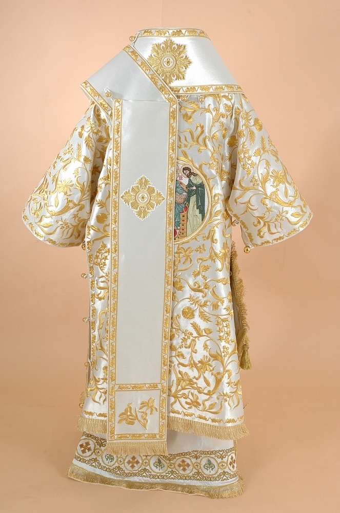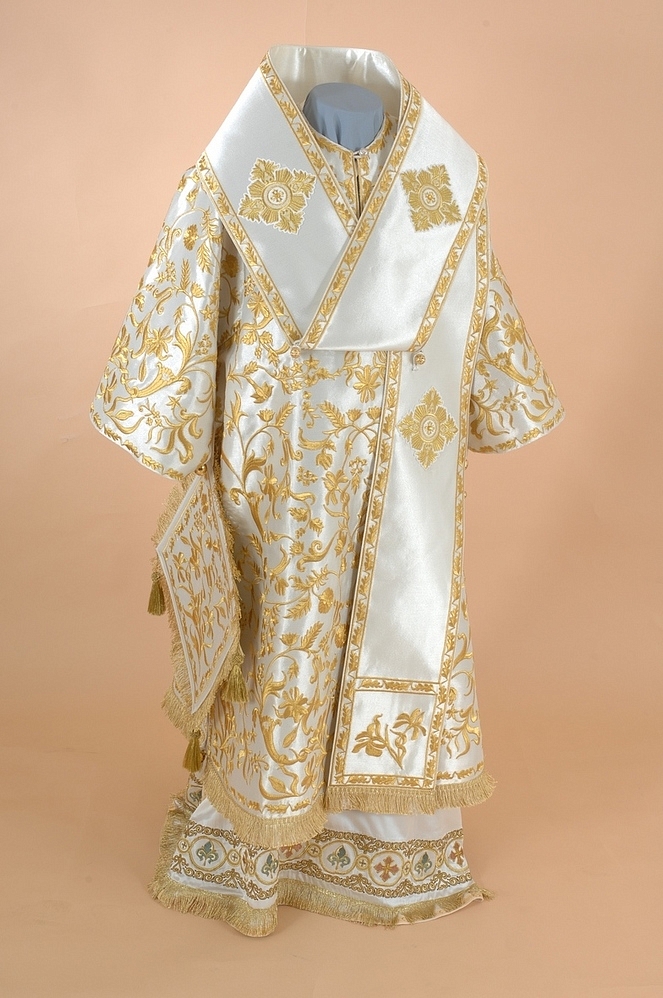 Архиерейское облачение, выполненное из греческого глазета. В комплект входит 8 предметов: саккос, епитрахиль, поручи, пояс, большой омофор, малый омофор, палица, сулок.