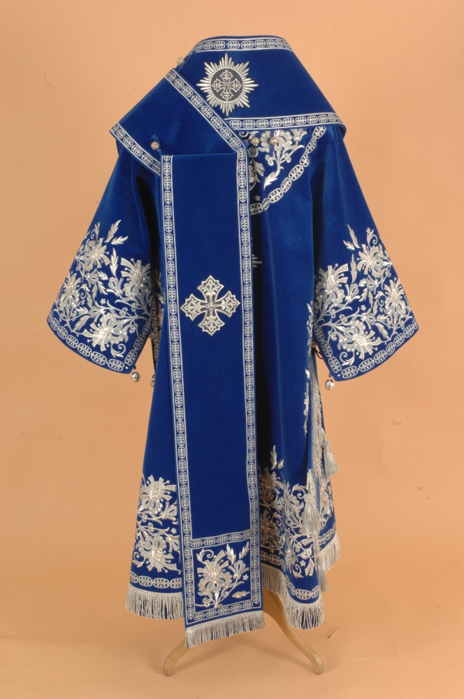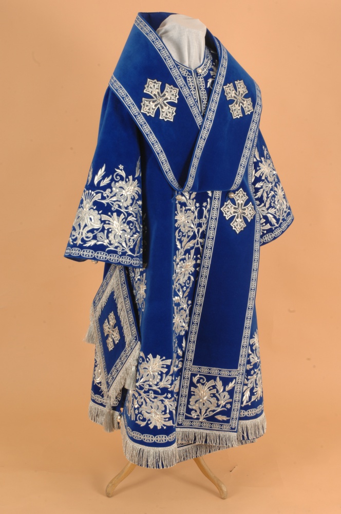 Архиерейское облачение, выполненное из натурального немецкого бархата. В комплект входит 8 предметов: саккос, епитрахиль, поручи, пояс, большой омофор, малый омофор, палица, сулок.