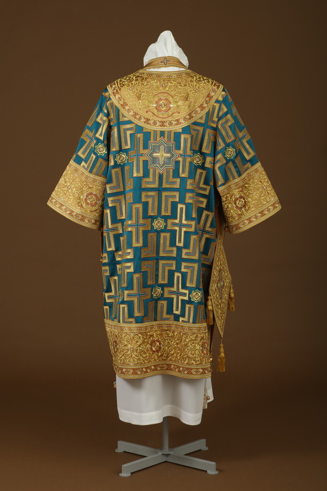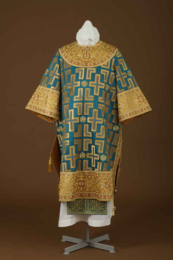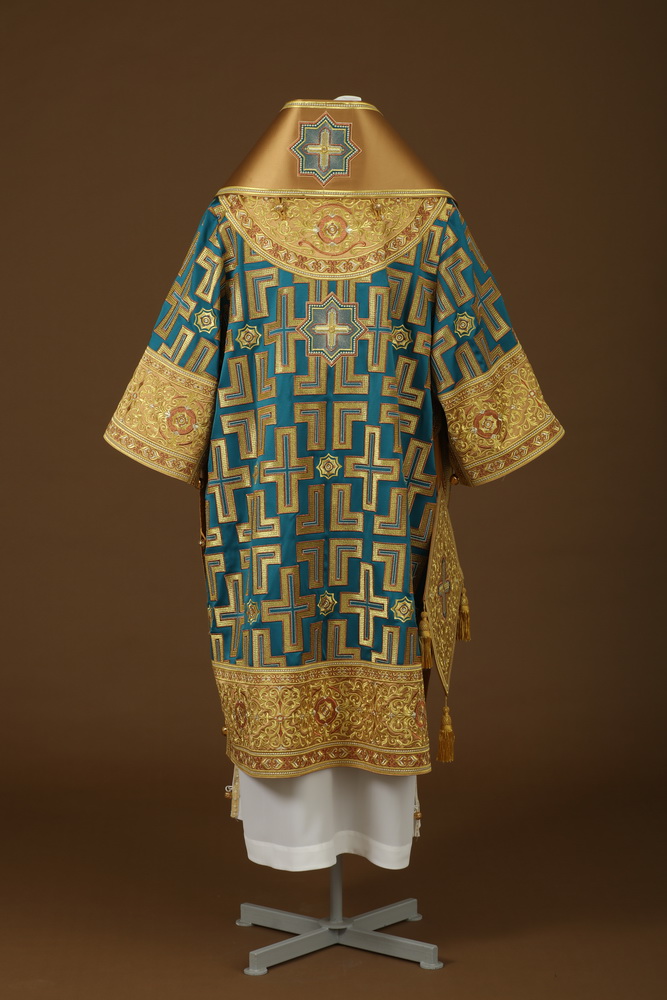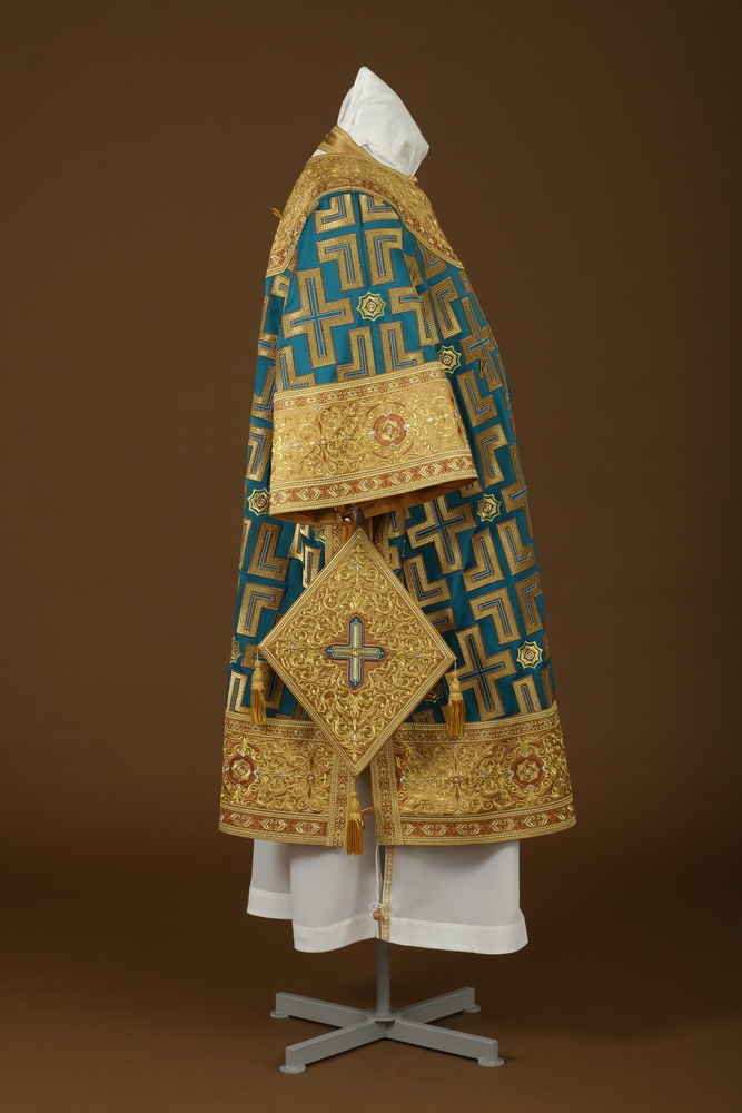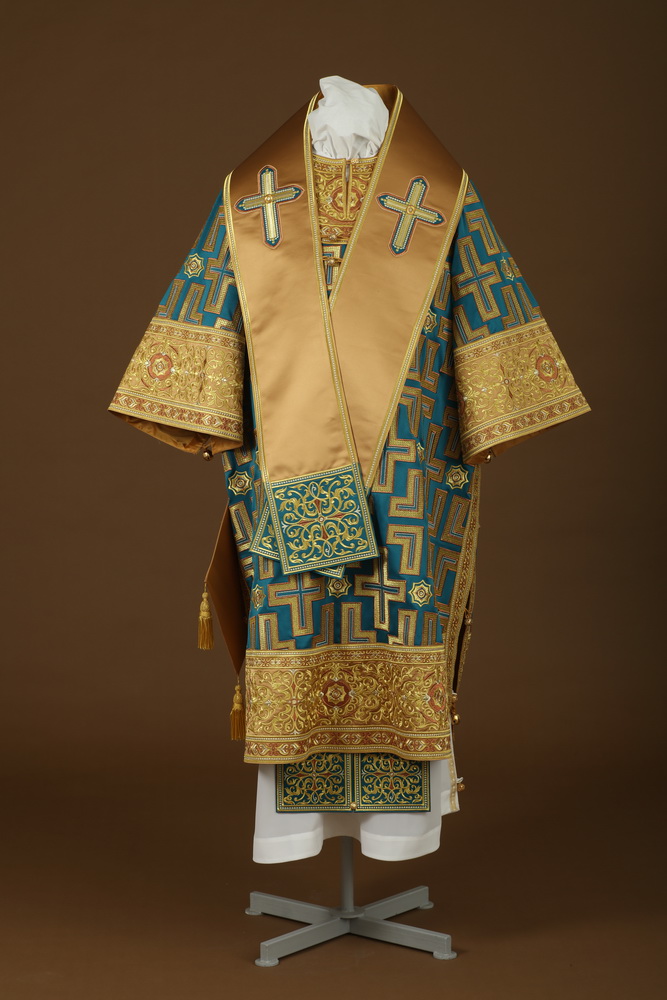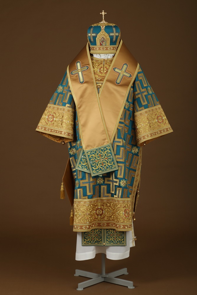 Архиерейское облачение, выполненное из шелка. В комплект входит 8 предметов: саккос, епитрахиль, поручи, пояс, большой омофор, малый омофор, палица, сулок.