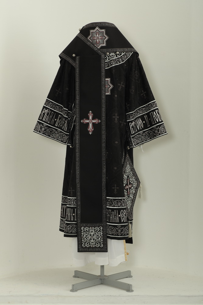 Отделочные элементы: автоматическая вышивка, вышитые иконы с живописными ликами, вышитые галун и кресты, кисти на палице.
