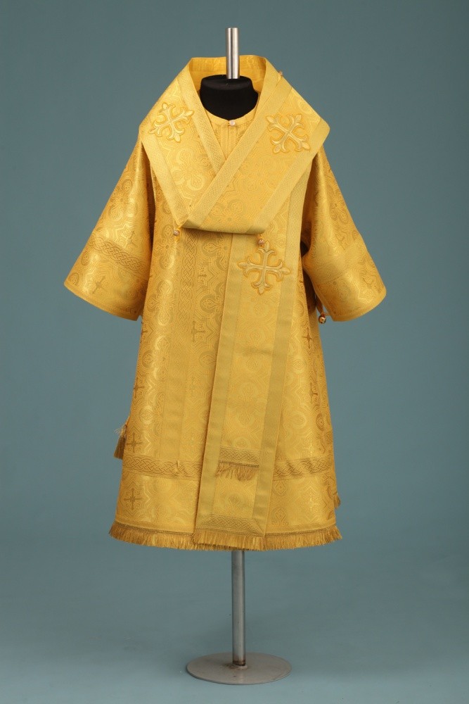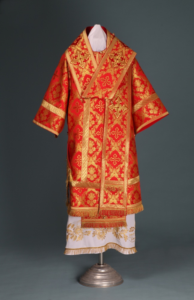 Архиерейское облачение, выполненное из российской парчи. В комплект входит 8 предметов: саккос, епитрахиль, поручи, пояс, большой омофор, малый омофор, палица, сулок.