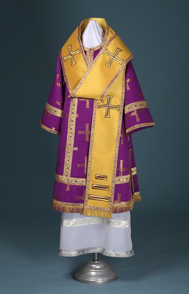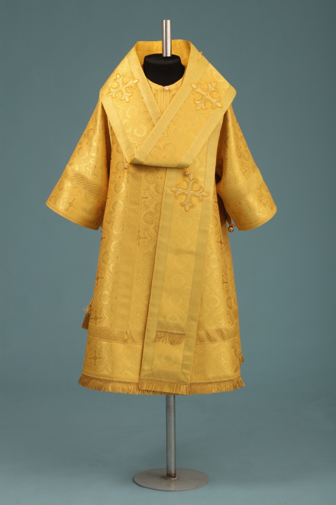 Отделочные элементы: галун, кресты, бахрома, кисти. Доступно исполнение во всех богослужебных цветах. По Вашему желанию мы можем внести изменения в отделку или заменить материал. К исполнению доступны все размеры. Подсакосник заказывается отдельно.