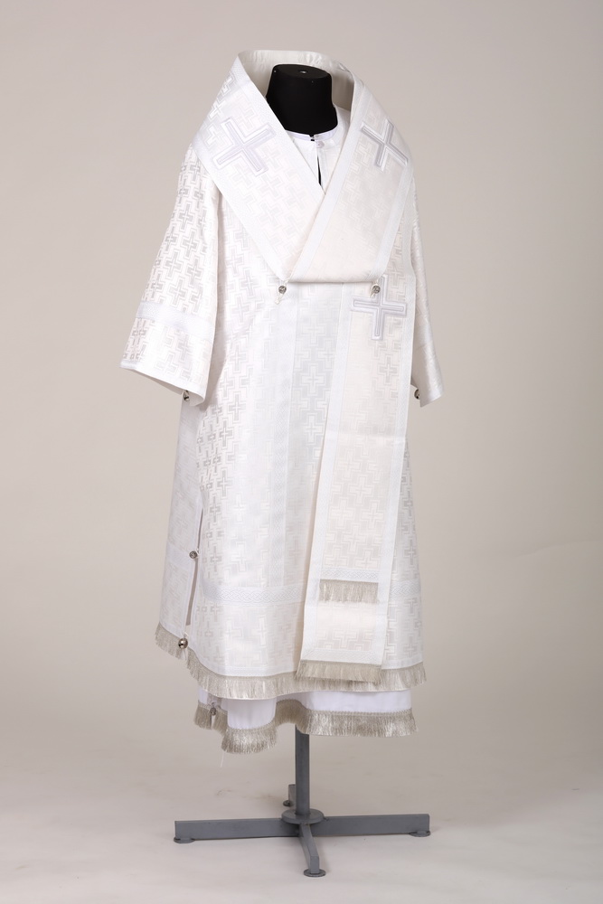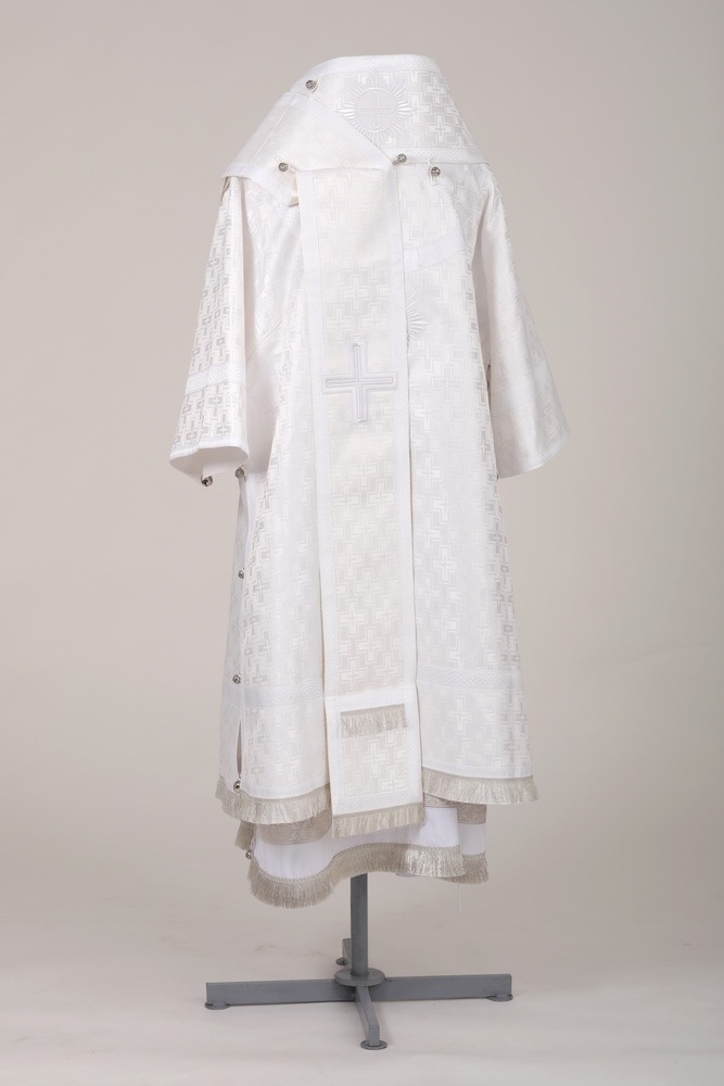 Архиерейское облачение выполненное из шелка (Россия). В комплект входит 8 предметов: саккос, епитрахиль, поручи, пояс, большой омофор, малый омофор, палица, сулок.