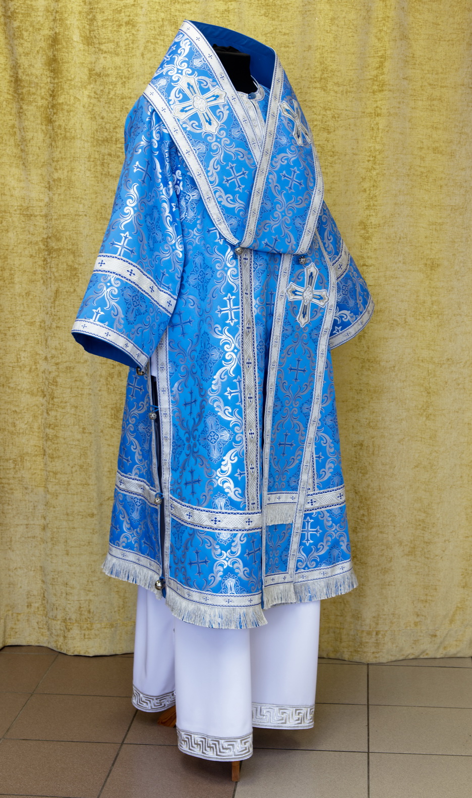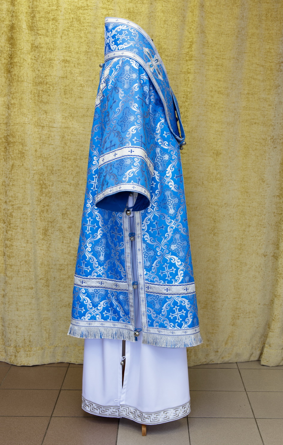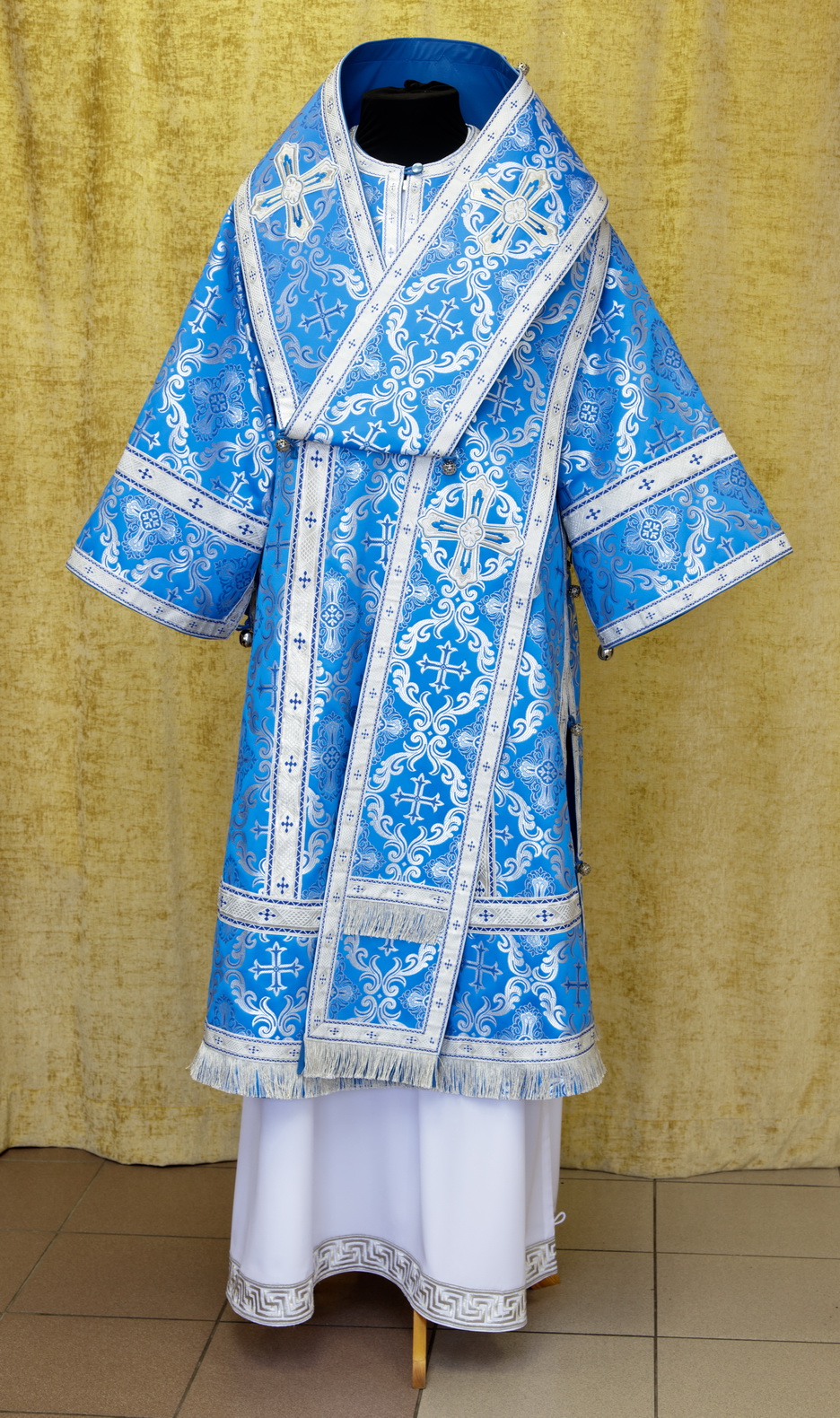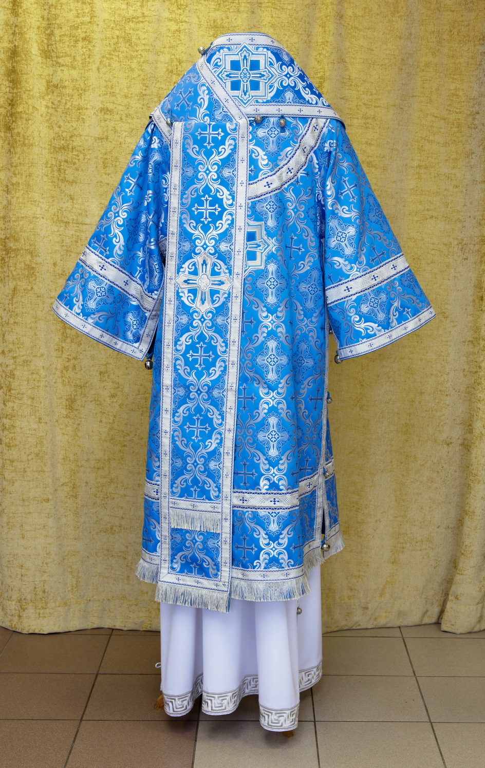 Отделочные элементы: галун, вышитые кресты, бахрома, кисти на палице. Доступно исполнение во всех богослужебных цветах. По Вашему желанию мы можем внести изменения в отделку или заменить материал. К исполнению доступны все размеры.