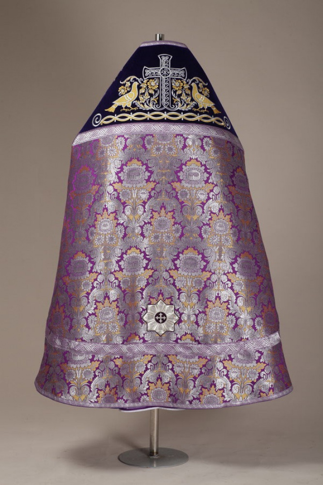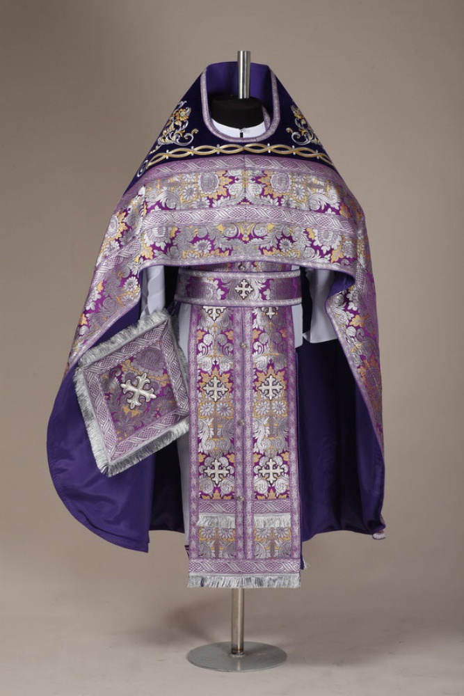 Облачение, выполненное из парчи (Россия), оплечье из немецкого натурального бархата. В комплект входит: фелонь, епитрахиль, поручи, пояс, набедренник, палица.