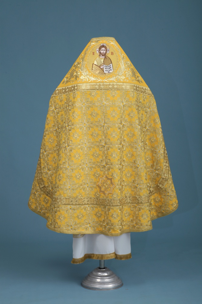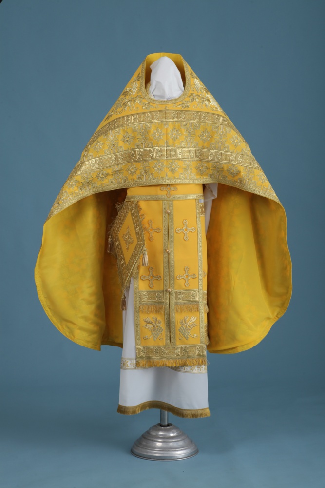 Облачение, выполненное из габардина. В комплект входит: фелонь, епитрахиль, поручи, пояс, набедренник, палица.