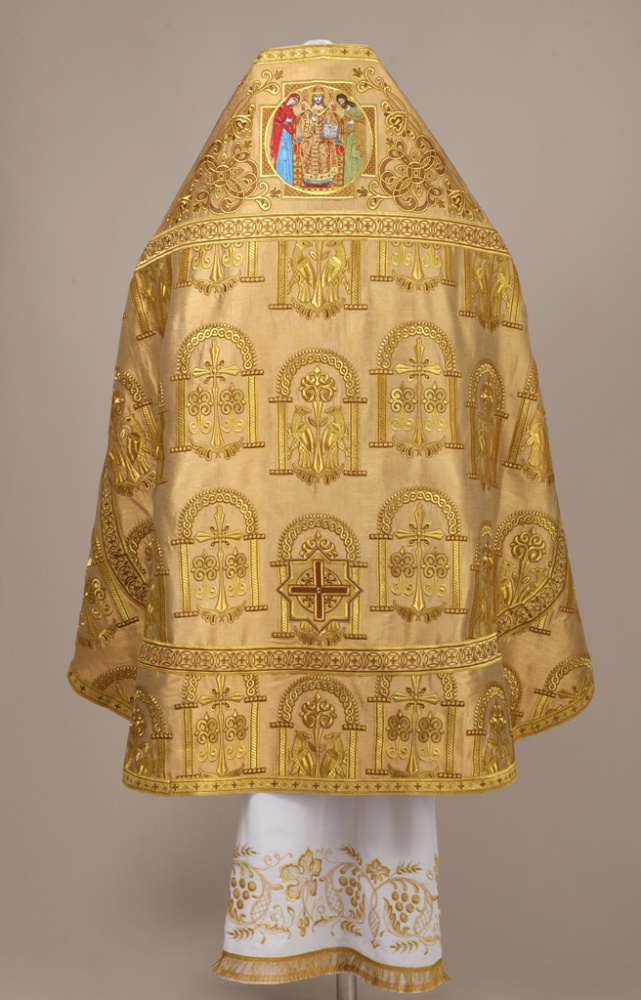 Облачение, выполненно из лионского шелка. В комплект входит: фелонь, епитрахиль, поручи, пояс, набедренник, палица.