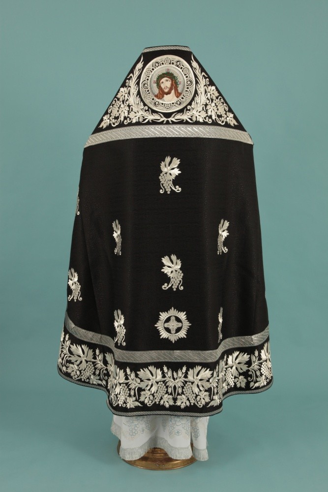 Отделочные элементы: галун, вышитые кресты, бахрома, вышитая икона, автоматическая вышивка по всей ткани.