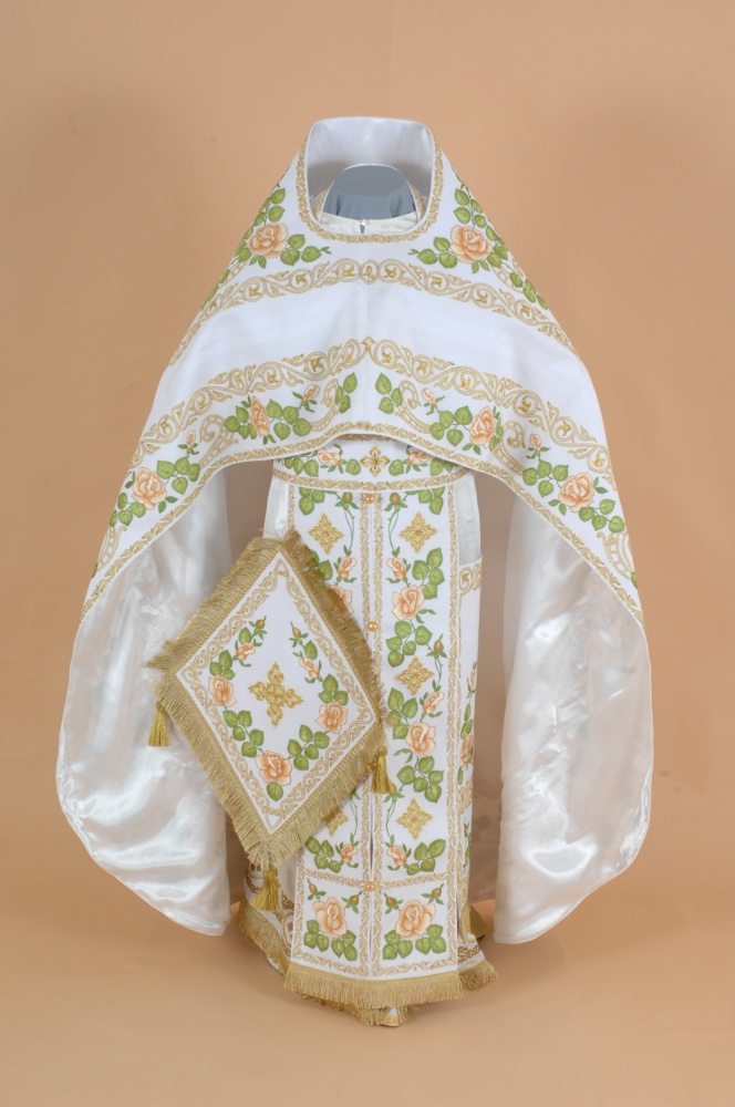 В комплект входит: фелонь, епитрахиль, поручи, пояс, набедренник, палица.
